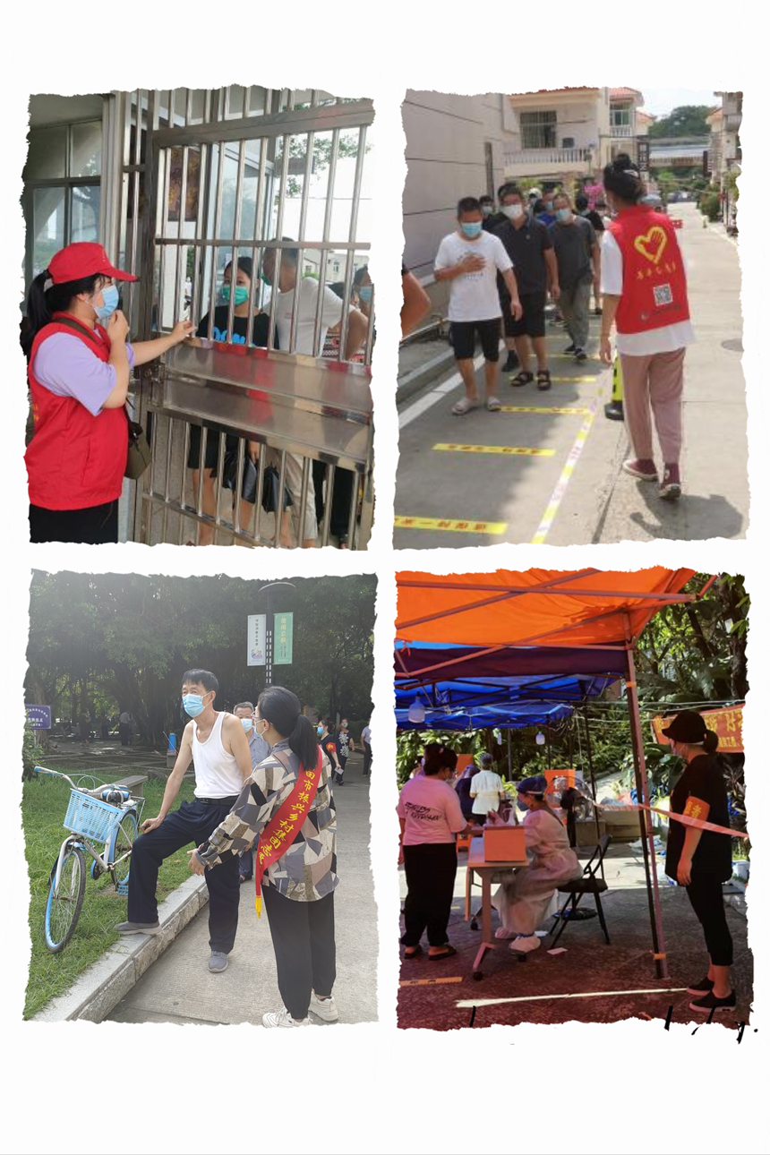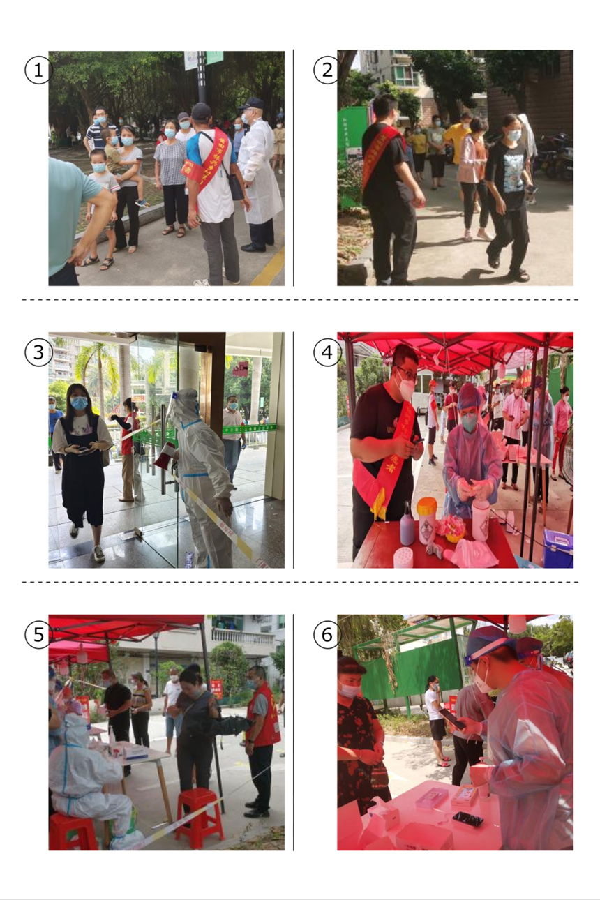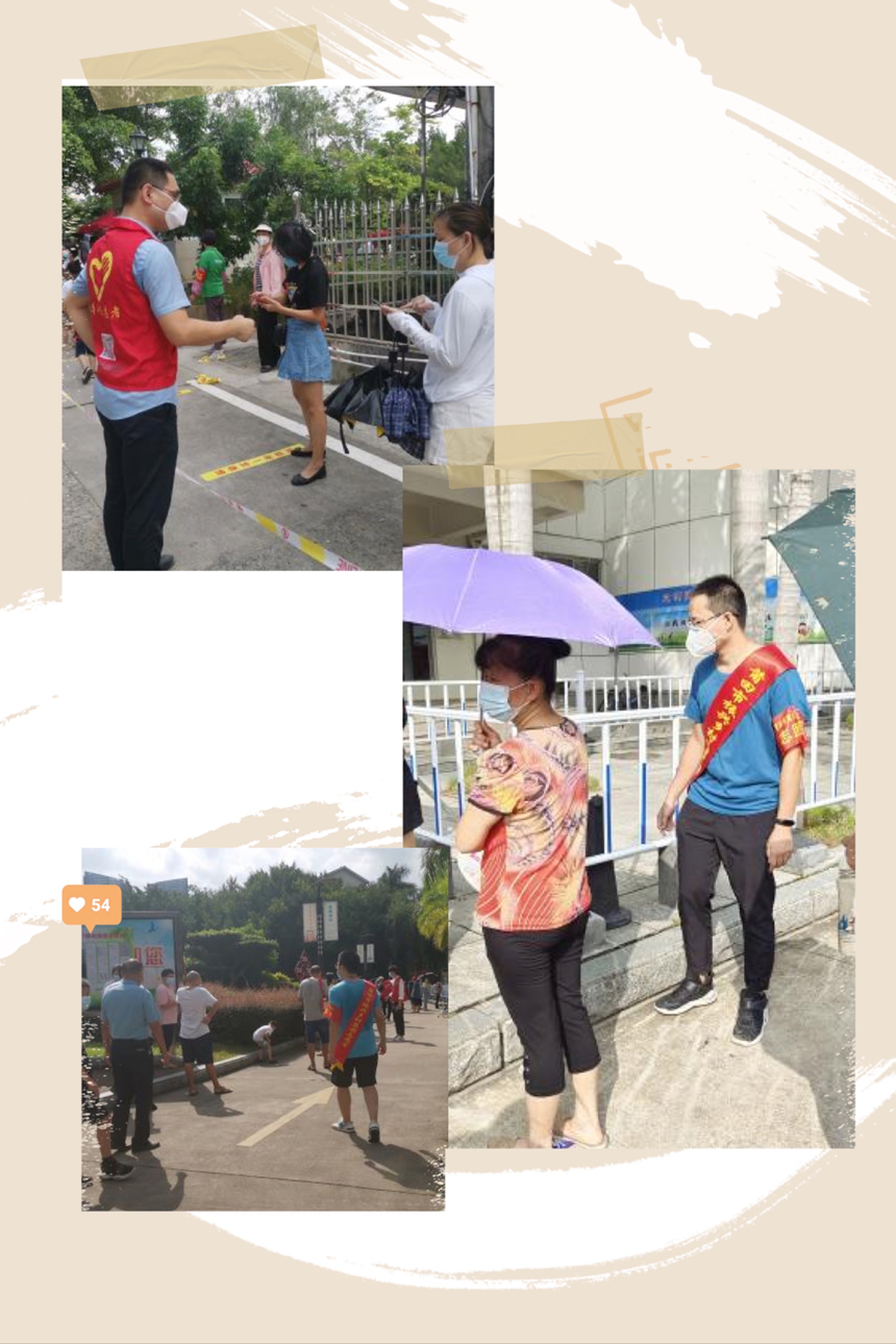 朱张、蔡海清、陈标等党员同志,曾继贤、姚振宇、黄宜斌、林健、林子明等干部职工,哪里有需要,哪里就有他们。他们先后来到市体育中心、南湖公园、石顶小区、荔园小区等地开展疫情防控志愿服务,协助医护人员核酸检测工作,对前来检测的市民进行秩序维护、体温测量、酒精消毒、出示健康码、信息录入等服务,对各个环节严格把关,全面阻击疫情。