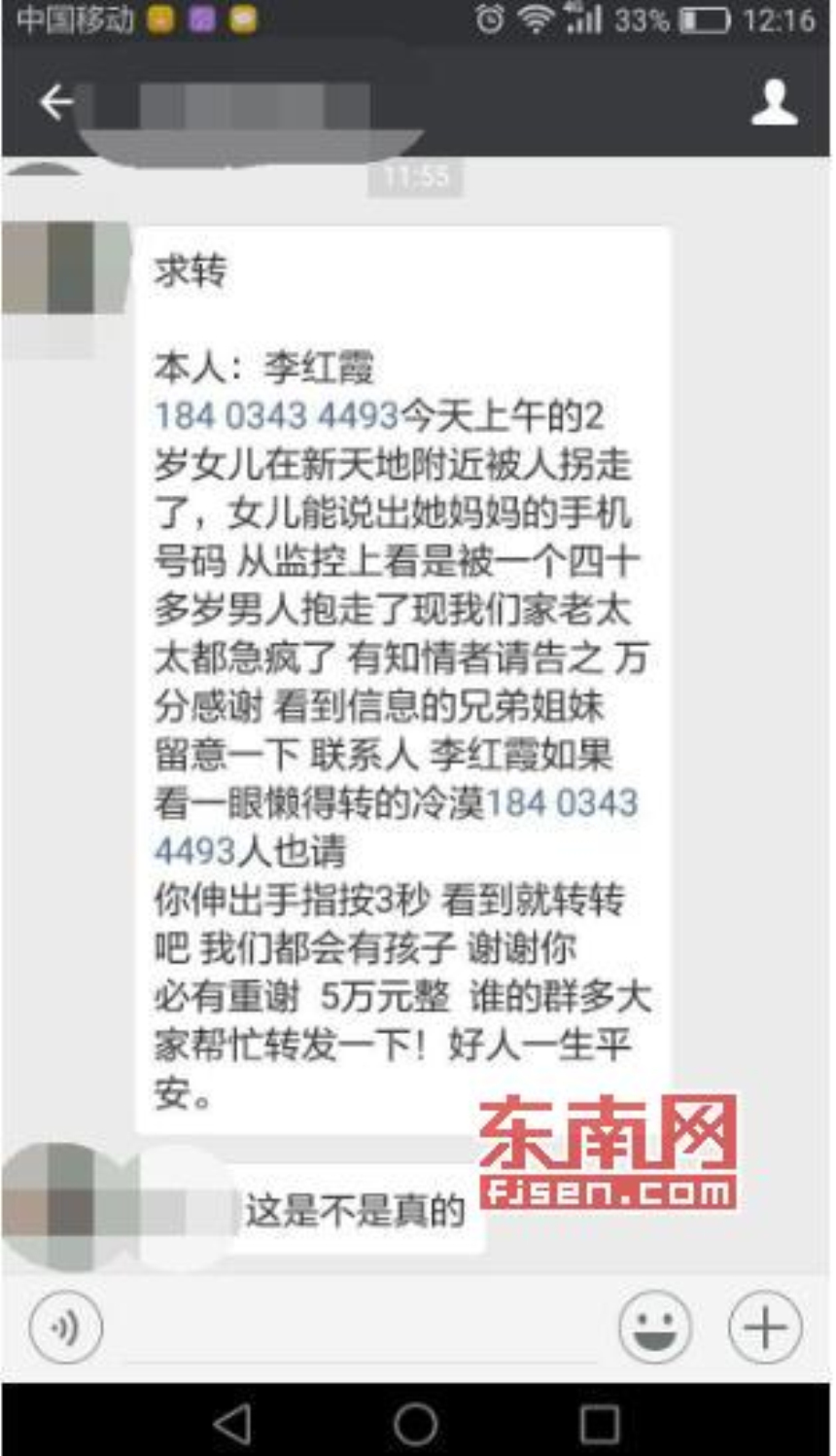 东南网莆田12月26日讯(本网记者 王龙风 通讯员 黄严丽)今日,有莆田网友向东南网“网络求真”反映,微信朋友圈内在传播一条2岁女孩在新天地被拐的信息,欲求证真相。东南网记者从莆田市公安局指挥情报中心了解到,莆田警方并未接到该起警情。 “本人李红霞,今天上午,2岁女儿在新天地附近被人拐走了,女儿能说出她妈妈的手机号码,从监控上看是被一个四十多岁男人抱走了。现我们家老太太都急疯了,有知情者请告之,万分感谢。”今日,该则信息在莆田微信朋友圈内传播开。