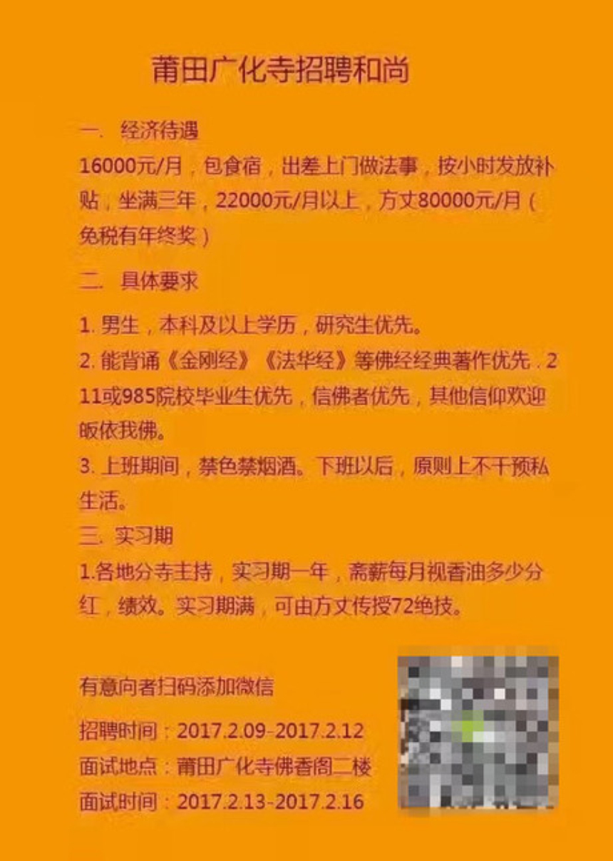东南网莆田2月10日讯(本网记者 李妙珠)市民何先生向东南网“网络求真”栏目反映,称微信朋友圈流传出一则“莆田广化寺招聘和尚”的信息,其上招聘待遇之高引起不少网友关注。对此,2月10日,莆田南山广化寺通过其官方微信公众号“莆田南山广化寺”发布声明,莆田南山广化寺从未对外发布任何招聘和尚的广告,也未曾授权他人以本寺的名义对外发布公告。 根据微信朋友圈流传的“莆田广化寺招聘和尚”信息显示,招聘信息包含经济待遇、具体要求和实习期三大方面内容,其中经济待遇丰厚,不仅月薪上万元且包食宿,并按小时发放补贴;在具体要求事项,除规定男性、本科及以上学历等具体要求,还写明上班期间禁色禁烟酒,下班以后,原则上不干预私生活;约定实习期一年,期满可由方丈传授72绝技。信息最后还注明了招聘时间、面试地点及时间,并附有微信二维码。