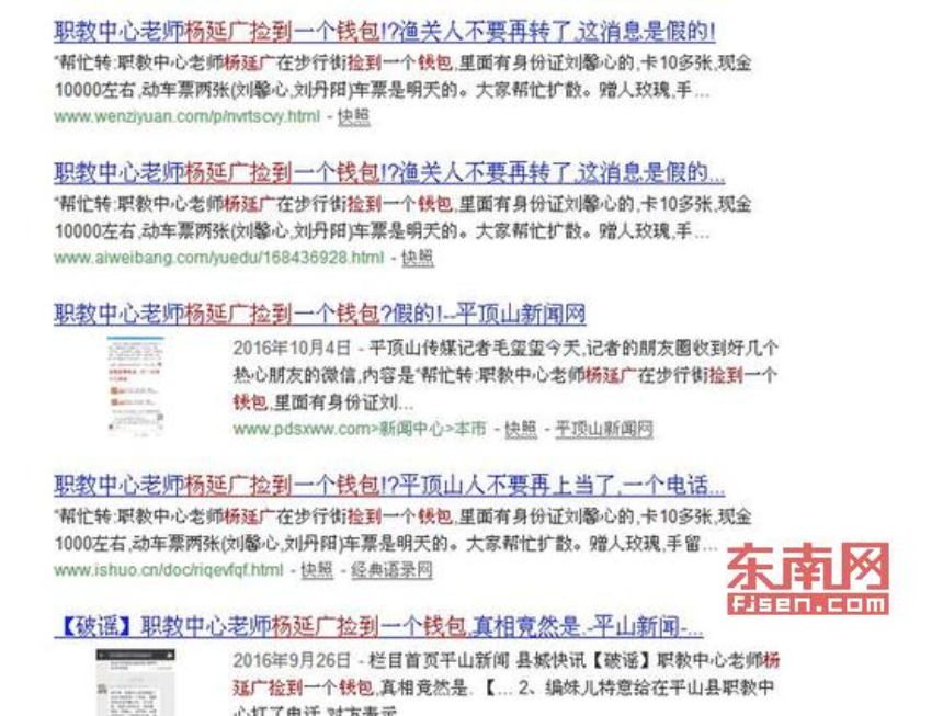 之后,东南网记者通过网上搜索“杨延广捡到钱包”关键字,发现其他地市就该信息也有进行了辟谣。