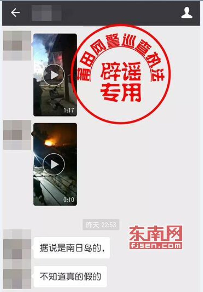 东南网莆田10月31日讯(本网记者 吴炳端)“据说南日岛发生火灾,不知道真的假的。”今日,有网友向东南网“网络求真”栏目反映,微信群里传有两段火灾视频,欲求证真假。东南网记者从莆田秀屿南日镇政府了解到,该镇近期并无类似烟花仓库发生火灾的事件。 此外,根据莆田市网安支队初步核查,其中一段时长1分17秒的视频与湖南省长沙县网络宣传管理办公室官方微博“长沙县发布”于7月5日发布的辟谣通报视频类似,基本可以判断为同一现场视频。根据“长沙县发布”通报,该视频也并非黄兴火灾现场视频。