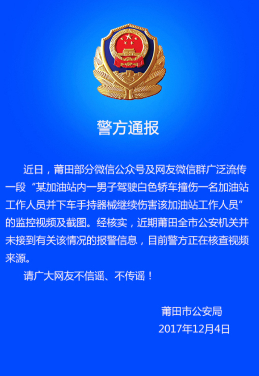 东南网莆田12月5日讯(本网记者 吴炳端)近日,莆田部分微信公众号及网友微信群广泛流传一段“某加油站内一男子驾驶白色轿车撞伤一名加油站工作人员并下车手持器械继续伤害该加油站工作人员”的监控视频及截图。东南网“网络求真”栏目记者从莆田市公安局获悉,经核实,莆田全市机关并未接到有关该情况的报警信息。