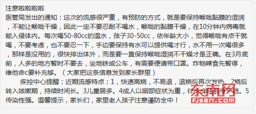 东南网莆田1月4日讯(本网记者 徐嘉馨)冬季是流感的高发期。近日,一条有关预防流感的信息在微信朋友圈中流传,部分内容为:“这次的流感很严重,有预防的方式,就是要保持喉咙黏膜的湿润,不能让喉咙干燥,因此一定不要忍耐不喝水……”东南网“网络求真”记者从莆田市疾控中心了解到,市疾控中心未发过此类通知,并强调喝水和保持喉咙湿润并不能有效预防流感。 莆田市疾控中心传染病防治科胡科长表示,网络上流传的这条“要一直保持喉咙湿润不干燥来预防流感”是不科学的。胡科长告诉东南网记者,冬季气温低,确实是流感的高发期。预防流感的有效方法是,每年到当地预防接种门诊,接种流感疫苗,尤其是老年人、体弱者和儿童。此外,要勤洗手,保持良好的个人及环境卫生,经常开窗通风,适量运动、充分休息,避免过度疲劳而不是喝水。