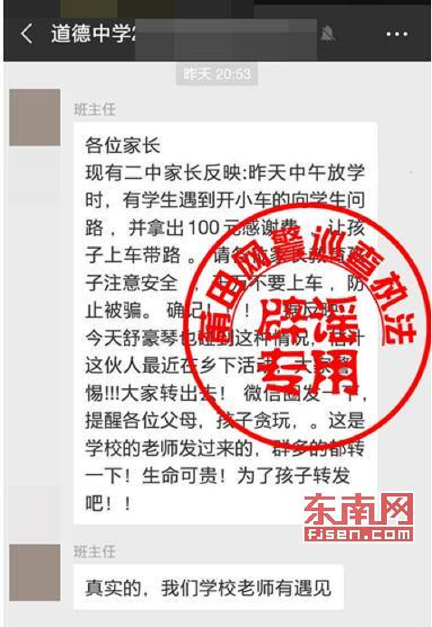 微信群聊截图(莆田市网安支队供图) 东南网莆田10月25日讯(本网记者 李妙珠 通讯员 黄蕾如)近日,有热心网友向东南网“网络求真”栏目反映,称网上流传着一张来自道德中学某班微信群的群聊截图,其主要内容为“用100元感谢费让孩子拐骗上车带路”的信息。东南网记者从莆田网安支队获悉,该信息不实。10月23日下午,仙游县网安大队传唤并询问了发布该信息的网民王某某。王某某表示转发该信息是出于对学生的安全考虑,但承认自己未经核实转发了该不实信息,造成了不良影响。经过教育训诫,王某某保证不再转发未经官方核实的此类消息。 根据网上流传的群聊截图显示,昵称“班主任”的网民发布:“各位家长,现有二中家长反映,昨天中午放学时,有学生遇到开小车的向学生问路,并拿出100元感谢费,让孩子上车带路……今天舒豪琴也碰到这种情况,估计这伙人最近在乡下活动,大家警惕……这是学校的老师发过来的,群多的都转一下!”最后补充道:“真实的,我们学校老师有遇见。”随后,群内网友纷纷将该信息通过微信群及朋友圈进行转发扩散。一时间,不少市民的微信朋友圈被该信息“刷屏”。 但经仙游网安大队核实了解,该信息不实。东南网记者也分别向莆田第二中学和仙游第二中学求证,校方均表示未接到家长有关此事的反映。 经核查,截图内的网民“班主任”确系道德中学某班班主任王某某,但道德中学并没有名为“舒豪琴”的学生。10月23日下午,仙游县网安大队传唤并询问了王某某。王某某表示,转发该信息的本意是出于对学生的安全考虑,但承认自己在未经核实的情况下,转发了其他群内看到的该不实信息,造成了不良影响。经过教育训诫,王某某写下了保证书,保证不再转发未经官方核实的消息。 虽然只是虚惊一场,但对孩子的安全教育也不能忽视。 警方提醒,教师、公检法等职业公信力较高,较为特殊,在转发类似网络传闻时更要谨慎,不要让自己成为替谣言背书的帮凶,好心办了坏事! |