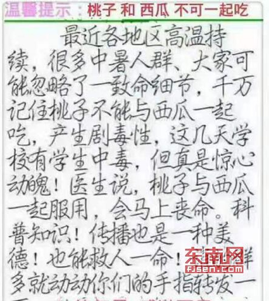 网传“西瓜和桃子不能一起吃”。网友供图 东南网莆田6月21日讯(本网记者 吴炳端 实习生 李艳瑜 赵然)“西瓜和桃子不能一起吃,会产生剧毒。”随着夏天的到来,这则消息又开始在坊间传播。那么桃子和西瓜同食到底会不会产生剧毒呢?东南网“网络求真”栏目记者从莆田市农业农村局了解到,从这两种水果的主要成分来看,不存在发生化学反应的物质基础,一起吃不会导致人体中毒,更不可能致人死亡。 莆田市农业农村局经济作物管理站工作人员介绍,桃子果肉中含有丰富的蛋白质、脂肪、糖、钙、磷、铁和维生素B、维生素C、胡萝卜素、有机酸(主要是苹果酸和柠檬酸)及大量的水分,这些成分能补充人体的营养所需。西瓜为夏季之水果,果肉味甜,能降温去暑;种子含油,可作消遣食品;果皮药用,有清热、利尿、降血压之效。从这两种水果的主要成分来看,不存在发生化学反应的物质基础,一起吃不会导致人体中毒,更不可能致人死亡。 桃子和西瓜同食虽然不会产生剧毒和引起丧命,但特殊人群还是要谨慎对待,不应一次食用太多。该工作人员表示,对于胃肠道功能较弱的人来说,食用冰镇西瓜很容易刺激胃肠道,从而出现腹胀或腹泻等症状。而桃子,特别是脆桃,不易消化,消化功能弱的人士不适宜多吃,以免引起消化不良。此外,这两种水果甜度较高,糖尿病患者也应注意适量食用。