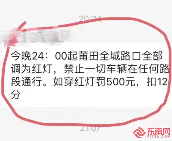 东南网莆田2月6日讯(本网记者 吴炳端)“今晚24时,莆田市全城路口全部调为红灯,禁止一切车辆在任何路段通行,如闯红灯罚500元,扣12分。”今晚,这则消息在莆田本地各微信群流传。东南网“网络求真”记者从莆田市公安局交警支队了解到,红绿灯未调整,是谣言! 莆田市公安局交警支队提醒广大市民朋友,有关莆田市道路交通的信息会通过莆田市公安局交警支队官方微信公众号“莆田行”进行发布。请广大网友不信谣,不传谣! 东南网“网络求真”记者从莆田市公安局网安支队了解到,若要进行交通管制,政府有关部门均会通过官方渠道予以公告,请勿轻信小道传闻,不信谣,不传谣!