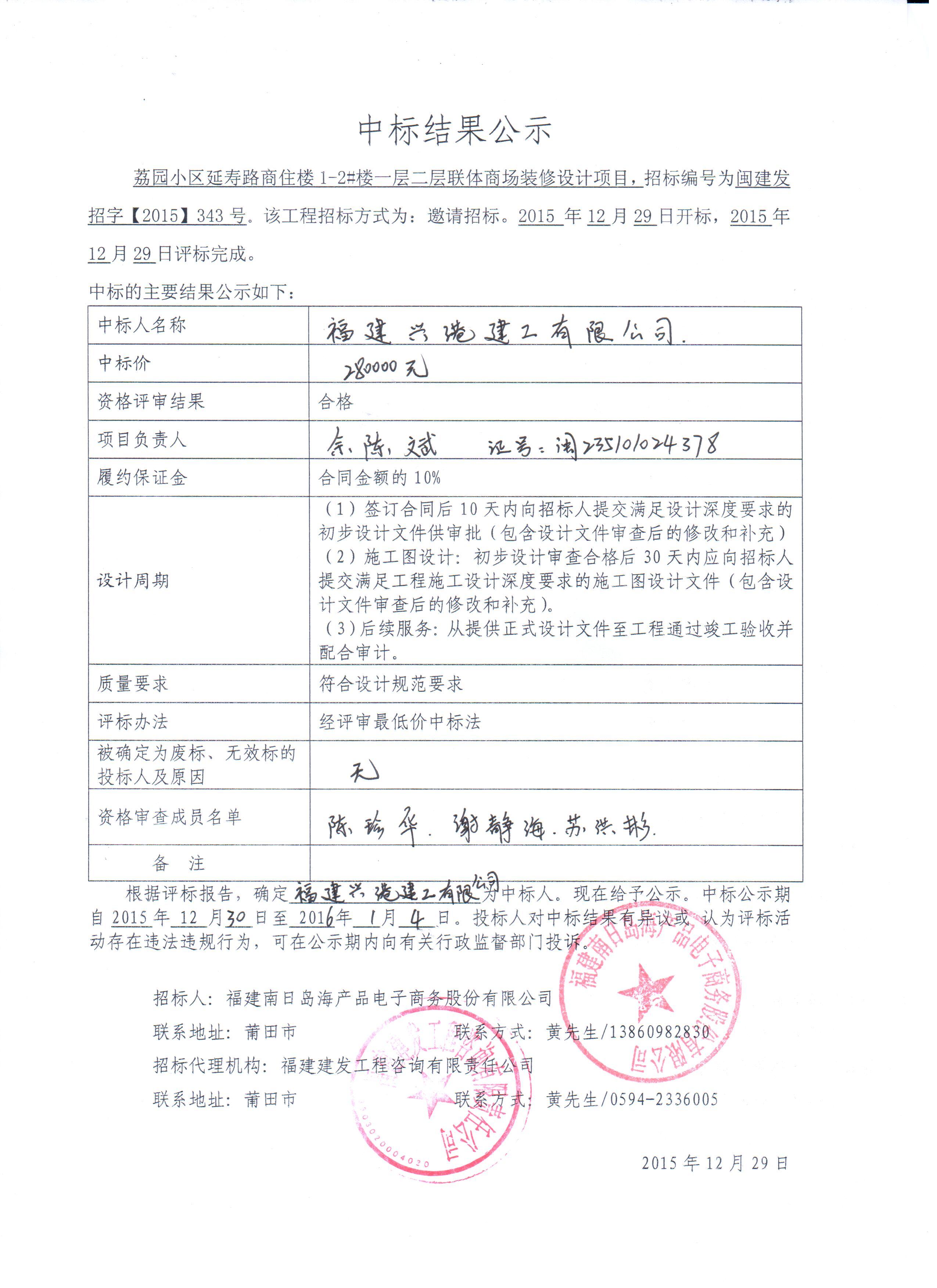 荔园小区延寿路商住楼1-2#楼一层二层联体商场装修设计项目中标结果公示
