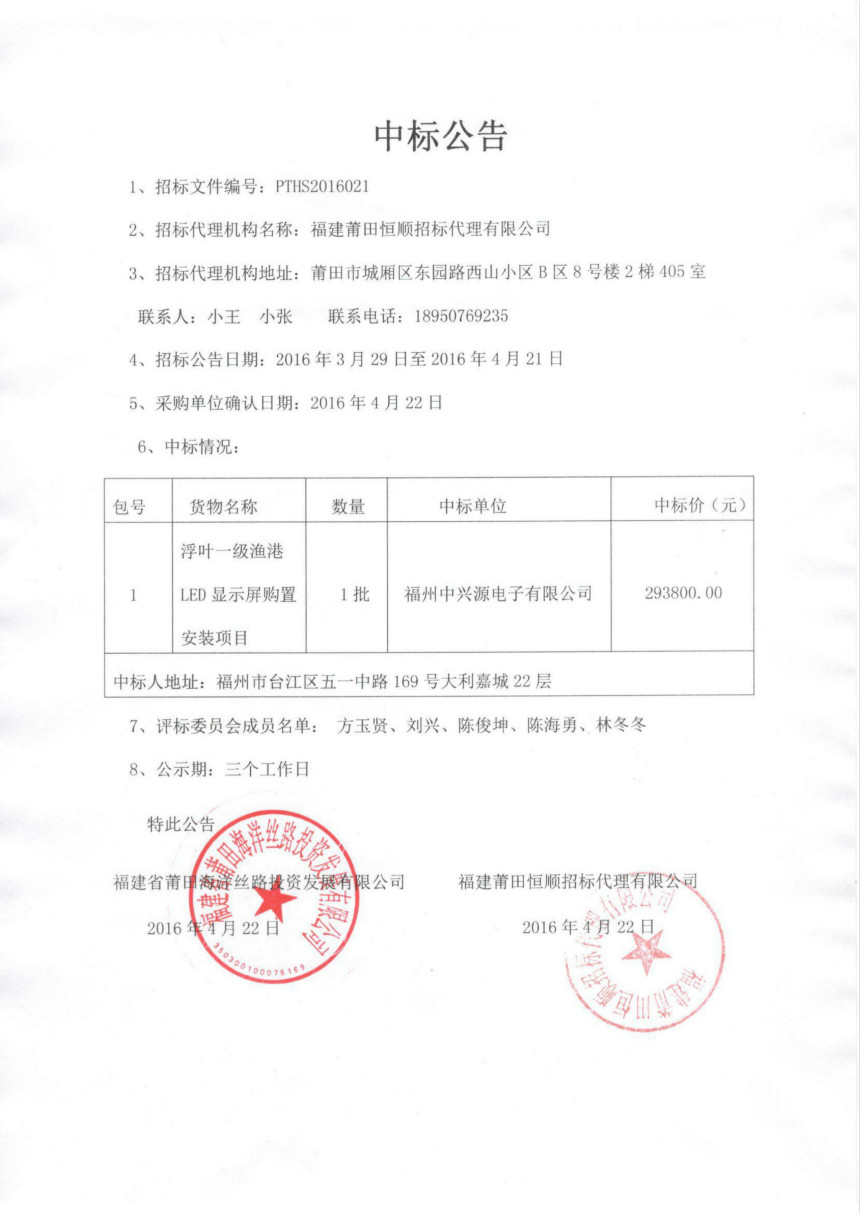 浮叶一级渔港LED显示屏购置安装项目中标公告