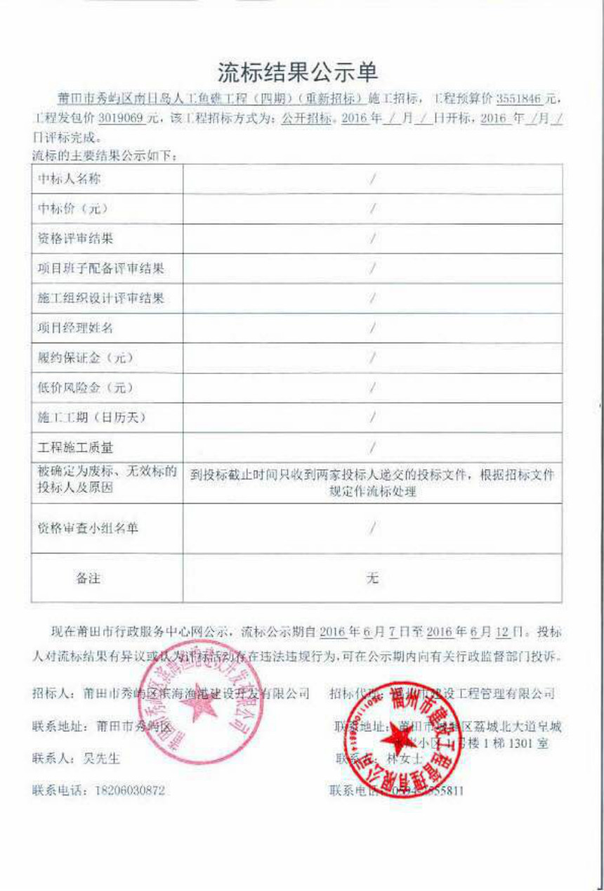 莆田市秀屿区南日岛人工鱼礁工程(四期)流标结果公示