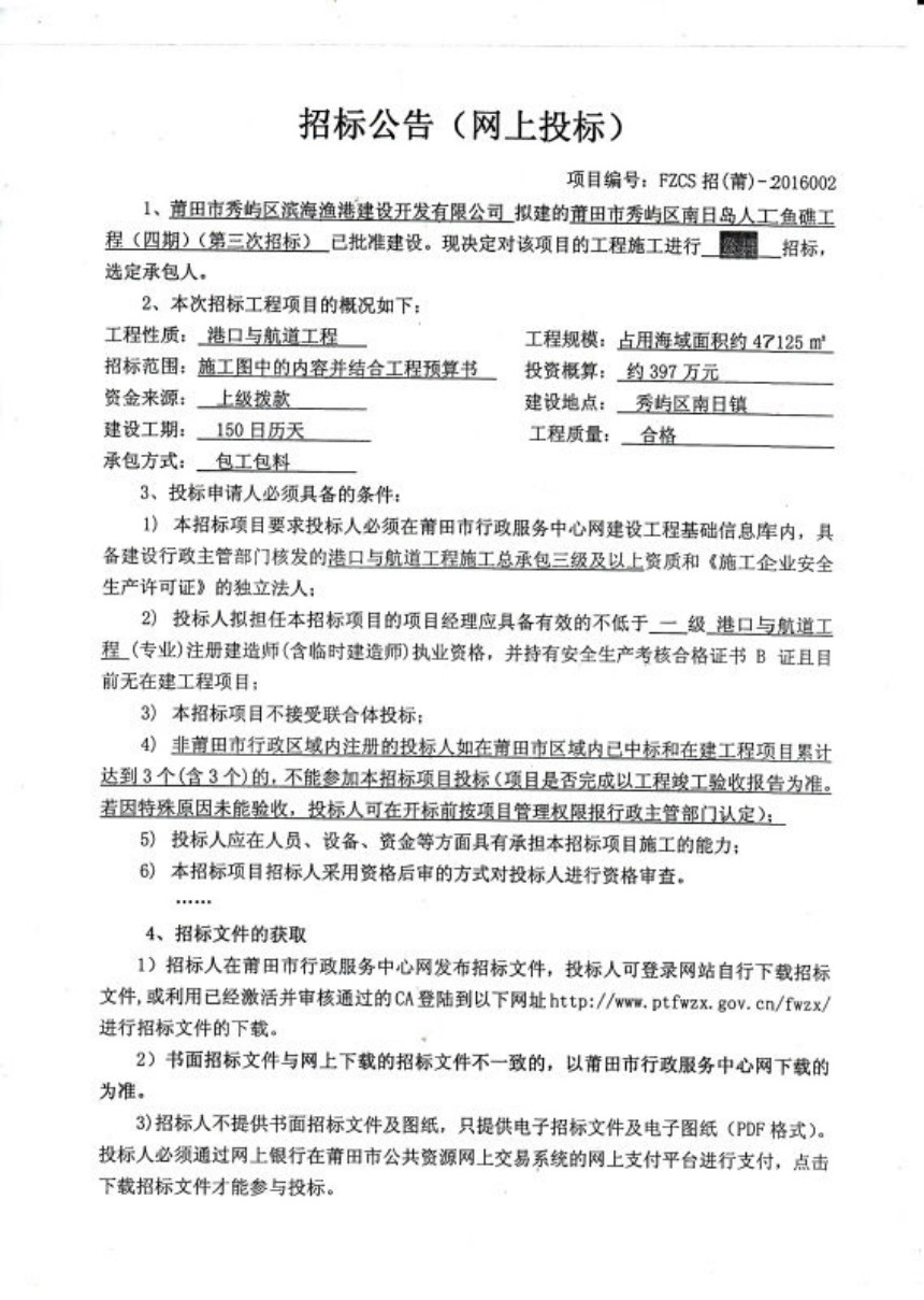 莆田市秀屿区南日岛人工鱼礁工程(四期)(第三次招标)