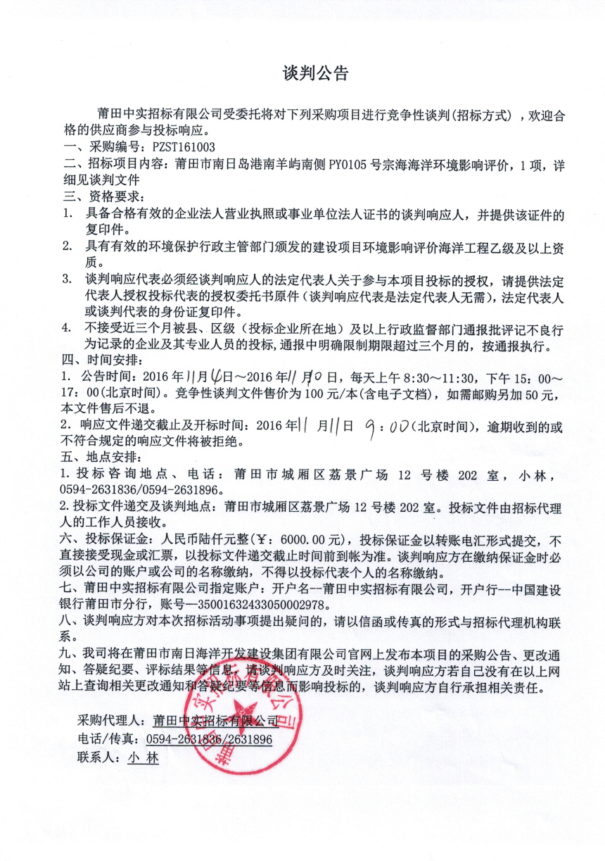 南日岛港南羊屿南侧PY0105号宗海竞争性谈判邀请公告