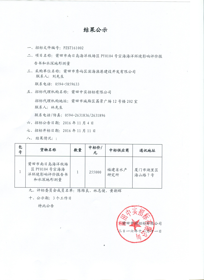 南日岛海洋牧场区PY0104号宗海海洋环境影响评价报告书和水深地形测量中标公告