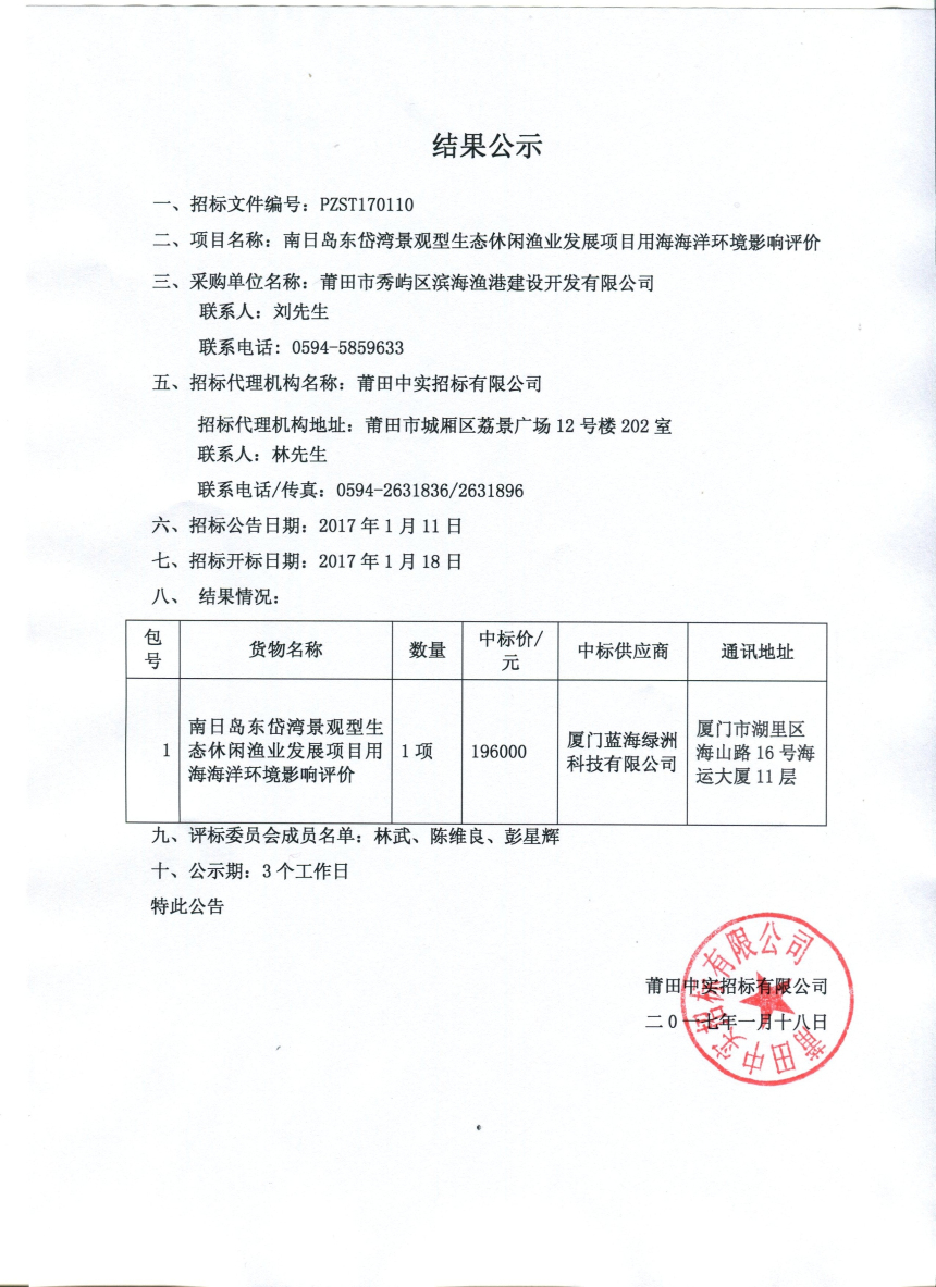 南日岛东岱湾景观型生态休闲渔业发展项目用海海洋环境影响评价竞争性谈判招标结果公示