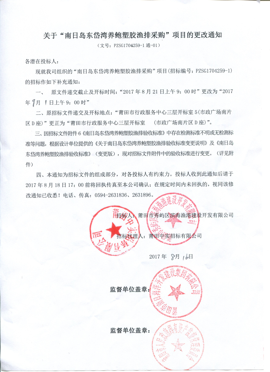 关于“南日岛东岱湾养鲍塑胶渔排采购”项目的更改通知