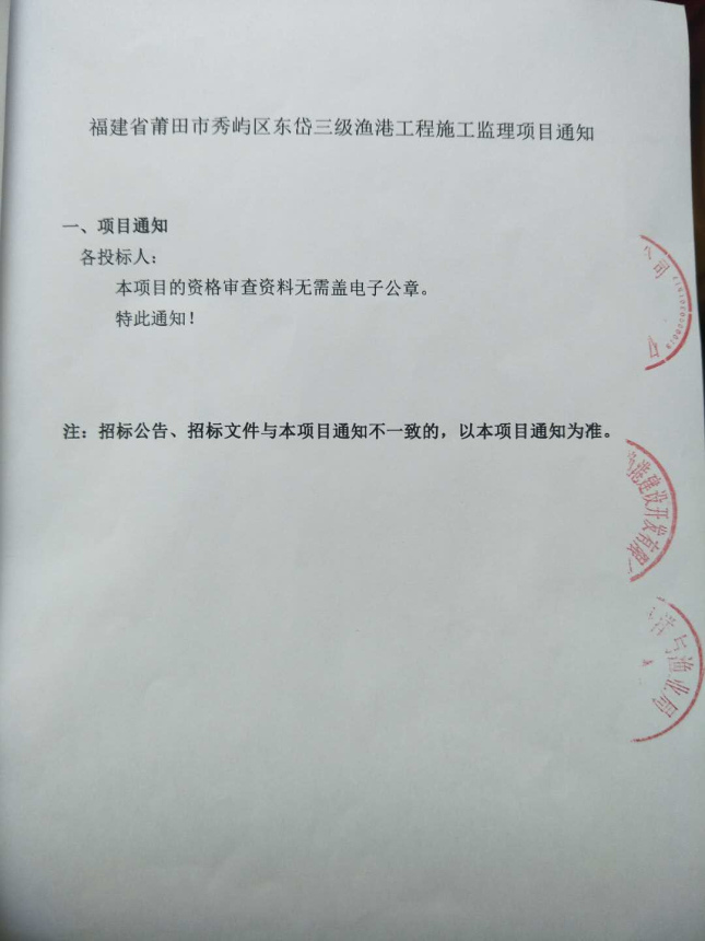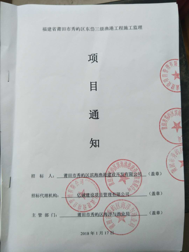 福建省莆田市秀屿区东岱三级渔港工程施工监理项目通知