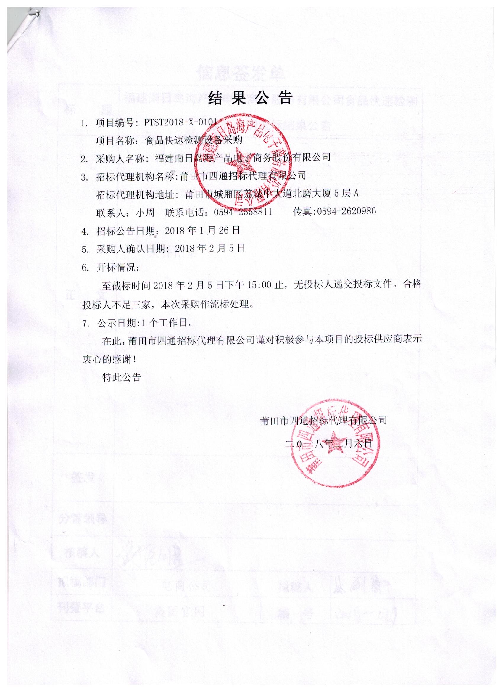 福建南日岛海产品电子商务股份有限公司食品快速检测设备采购流标结果公告