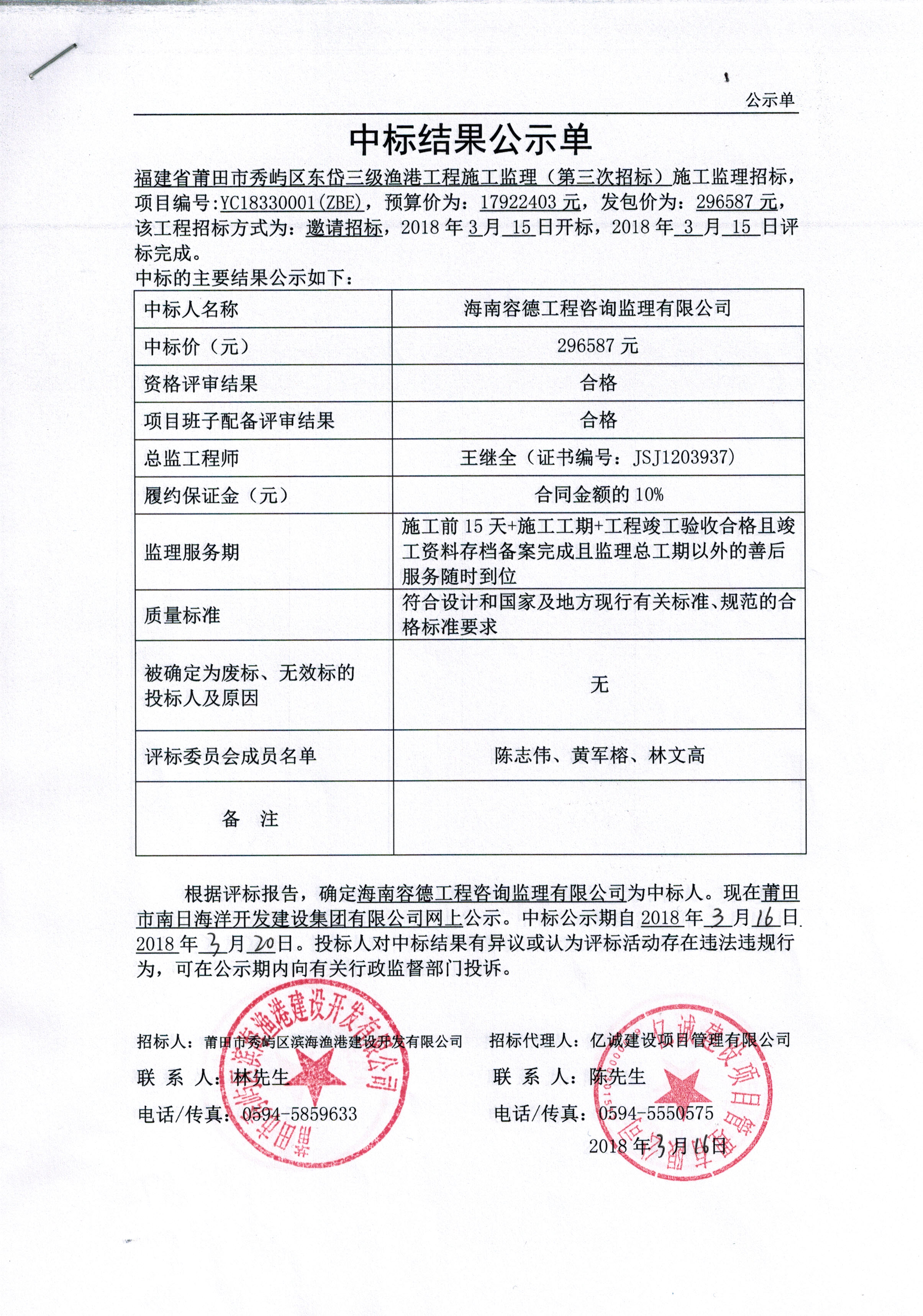 福建省莆田市秀屿区东岱三级渔港工程施工监理 (第三次招标)中标结果公示单