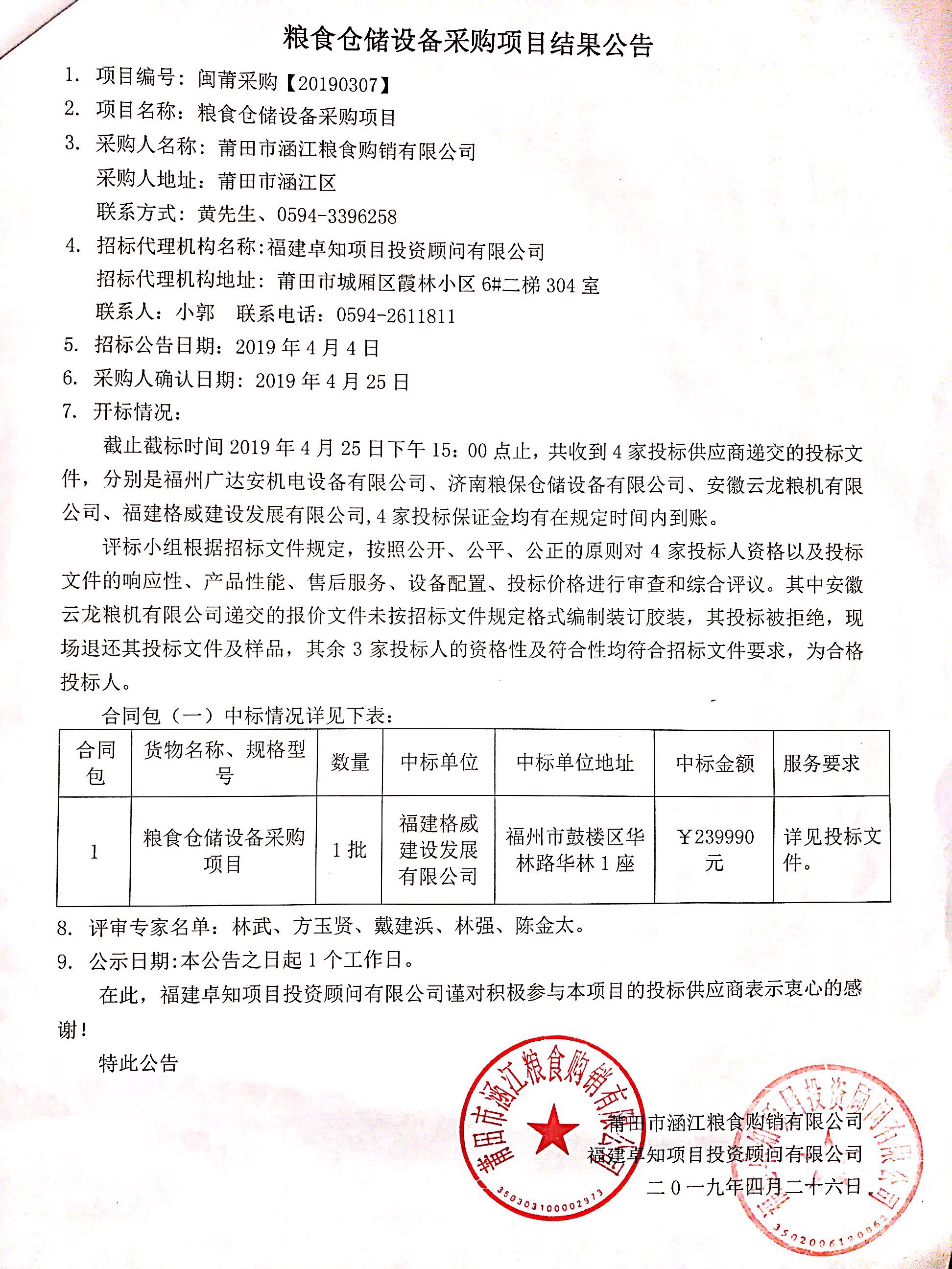 粮食仓储设备采购项目结果公告