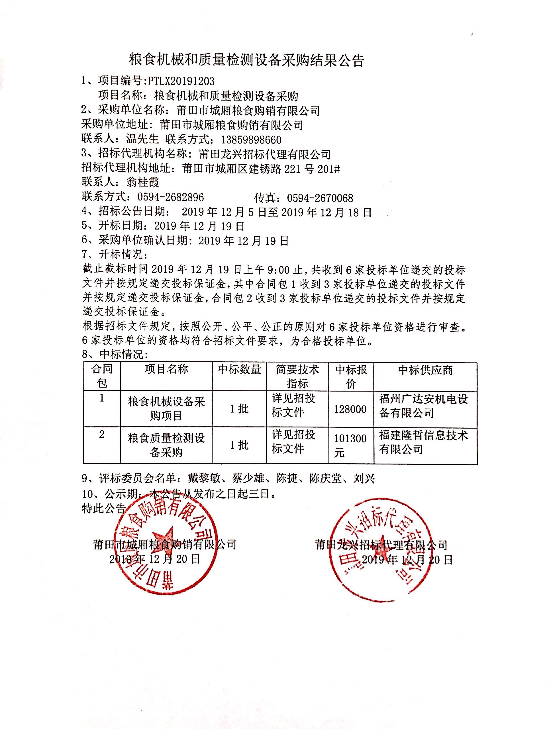 莆田市城厢粮食购销有限公司粮食机械和质量检测设备采购结果公告