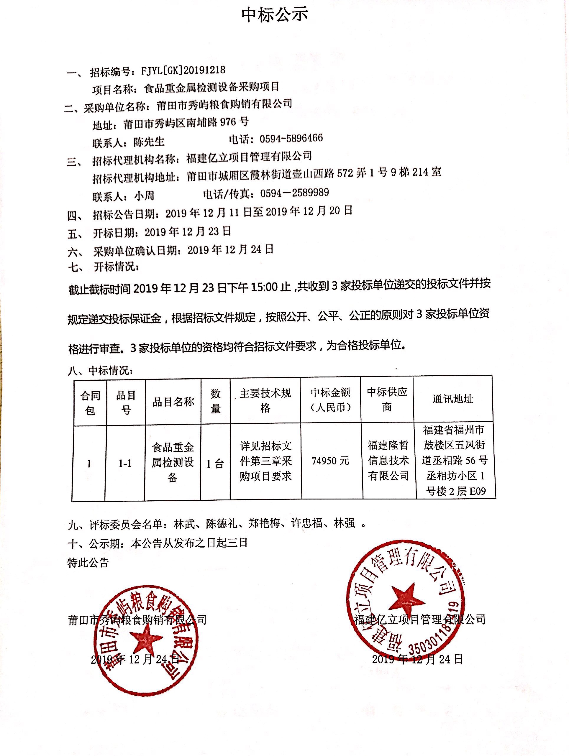 莆田市秀屿粮食购销有限公司食品重金属检测设备采购中标公示