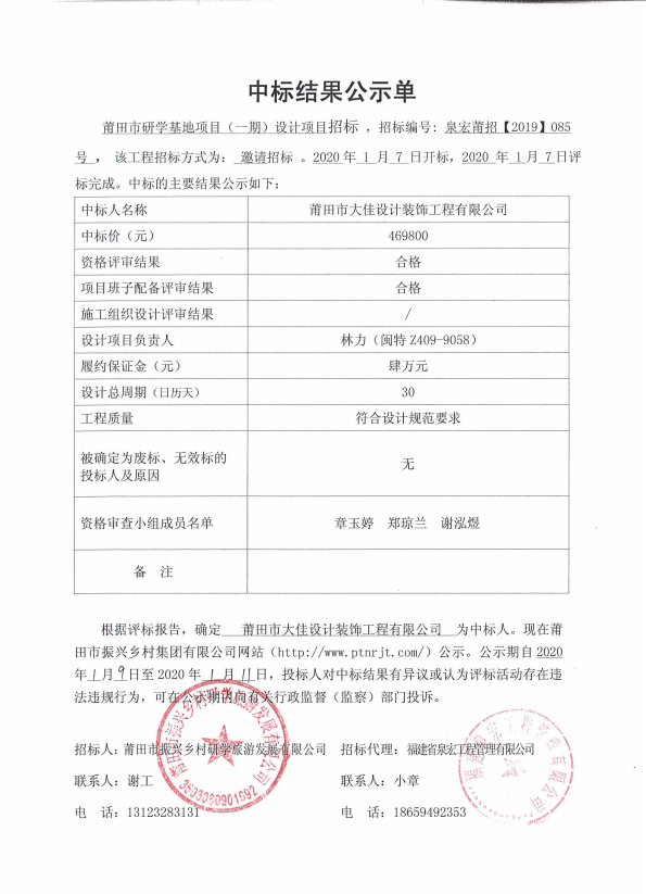 莆田市研学基地项目(一期)设计项目中标结果公示单