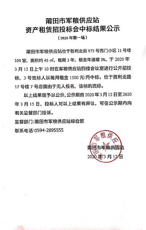 莆田市军粮供应站资产租招投标会中标结果公示(2020年第一场)