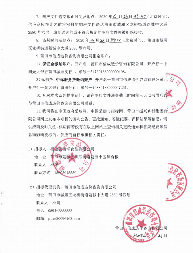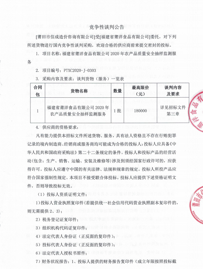 莆洋食品公司2020年农产品质量安全抽样监测服务竞争性谈判公告