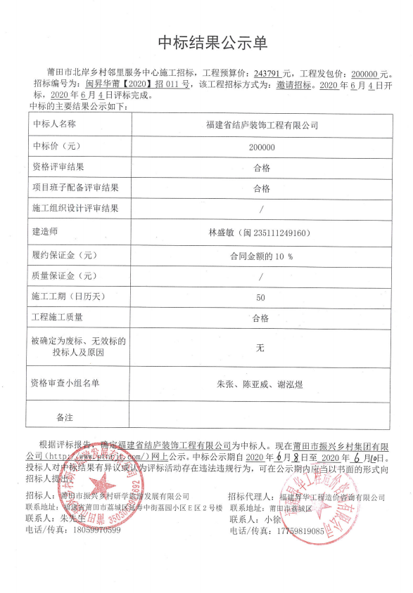 莆田北岸乡村邻里服务中心招标会中标结果公示