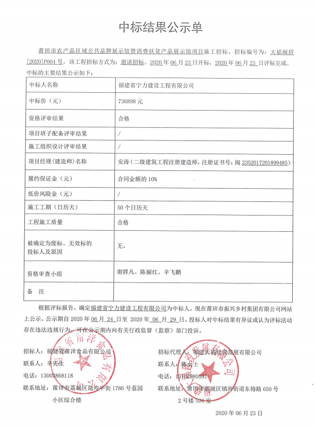 莆田市农产品区域公共品牌展示馆暨消费扶贫产品展示馆项目施工单位中标结果公示