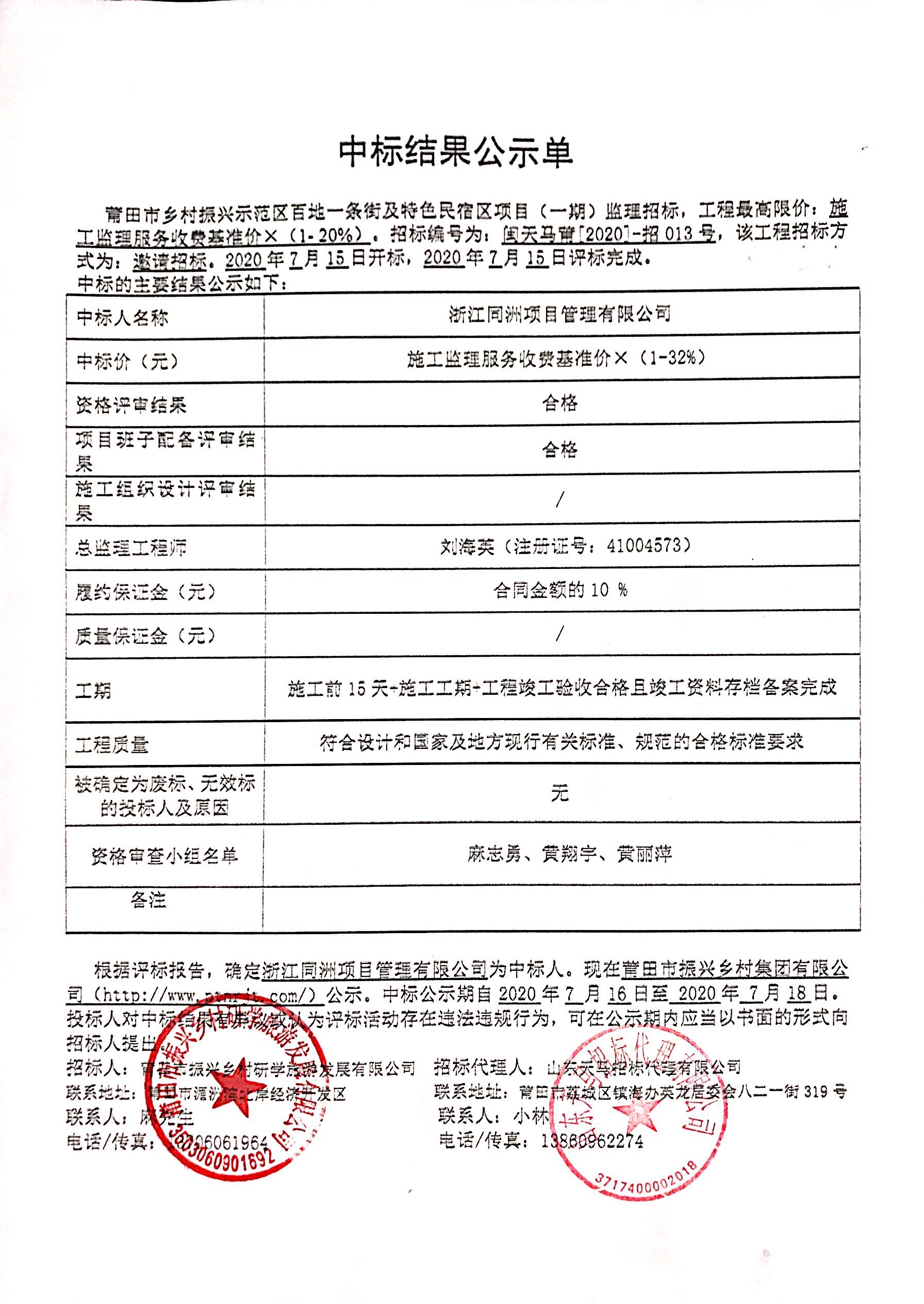 莆田市乡村振兴示范区百地一条街及特色民宿区项目监理单位中标结果公示单