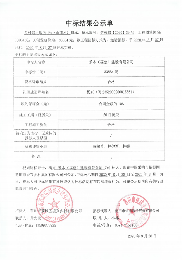 乡村邻里服务中心(山前村)项目施工单位中标结果公示单