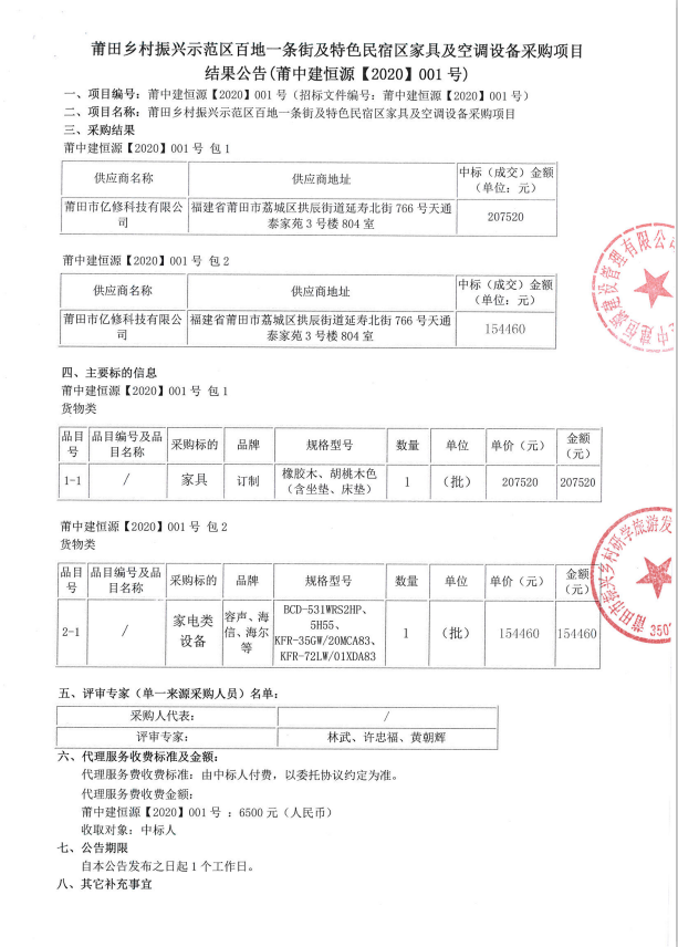 莆田乡村振兴示范区百地一条街及特色民宿区家具及空调设备采购项目结果公告