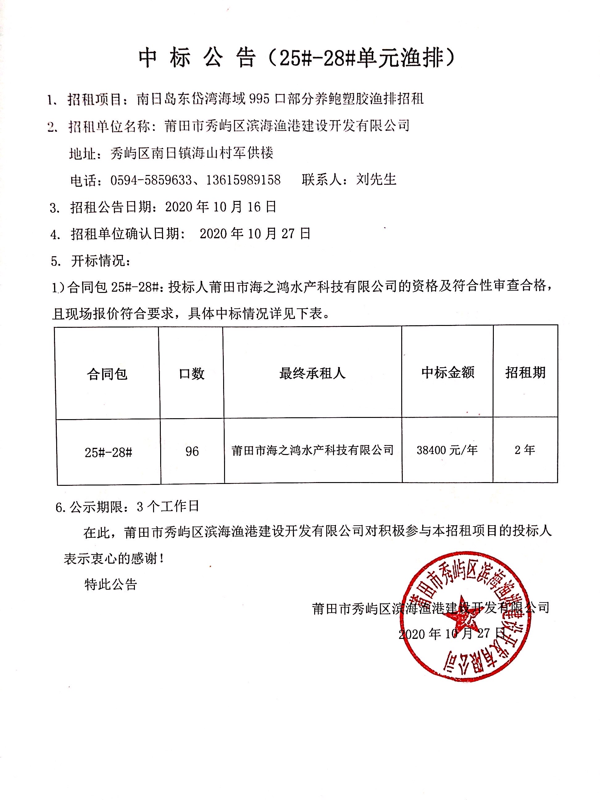 南日岛东岱湾海域995口部分养鲍塑胶渔排招租情况公告(四)(25#-28#单元渔排中标公告)