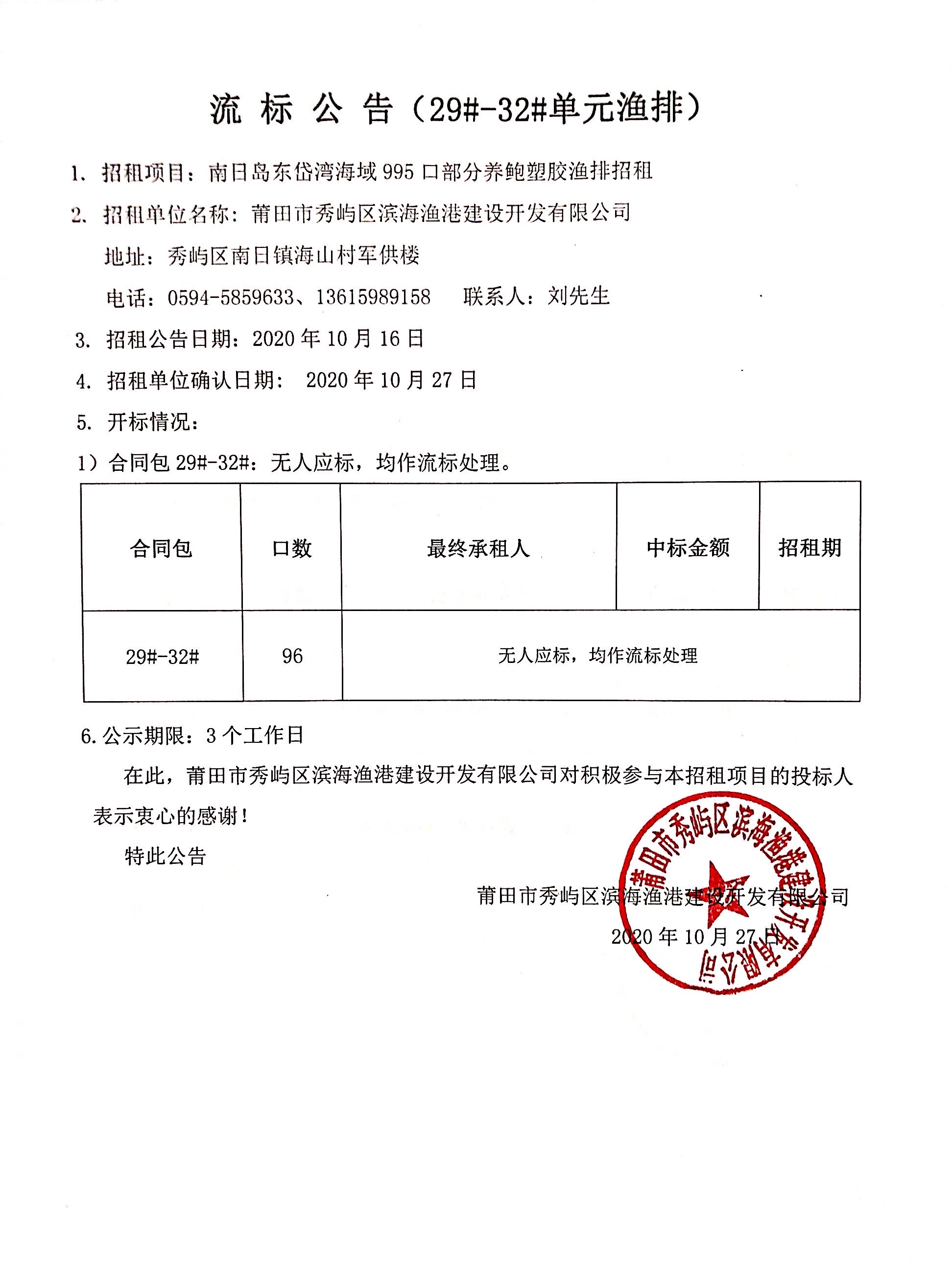 南日岛东岱湾海域995口部分养鲍塑胶渔排招租情况公告(八)(29#-32#单元渔排流标公告)
