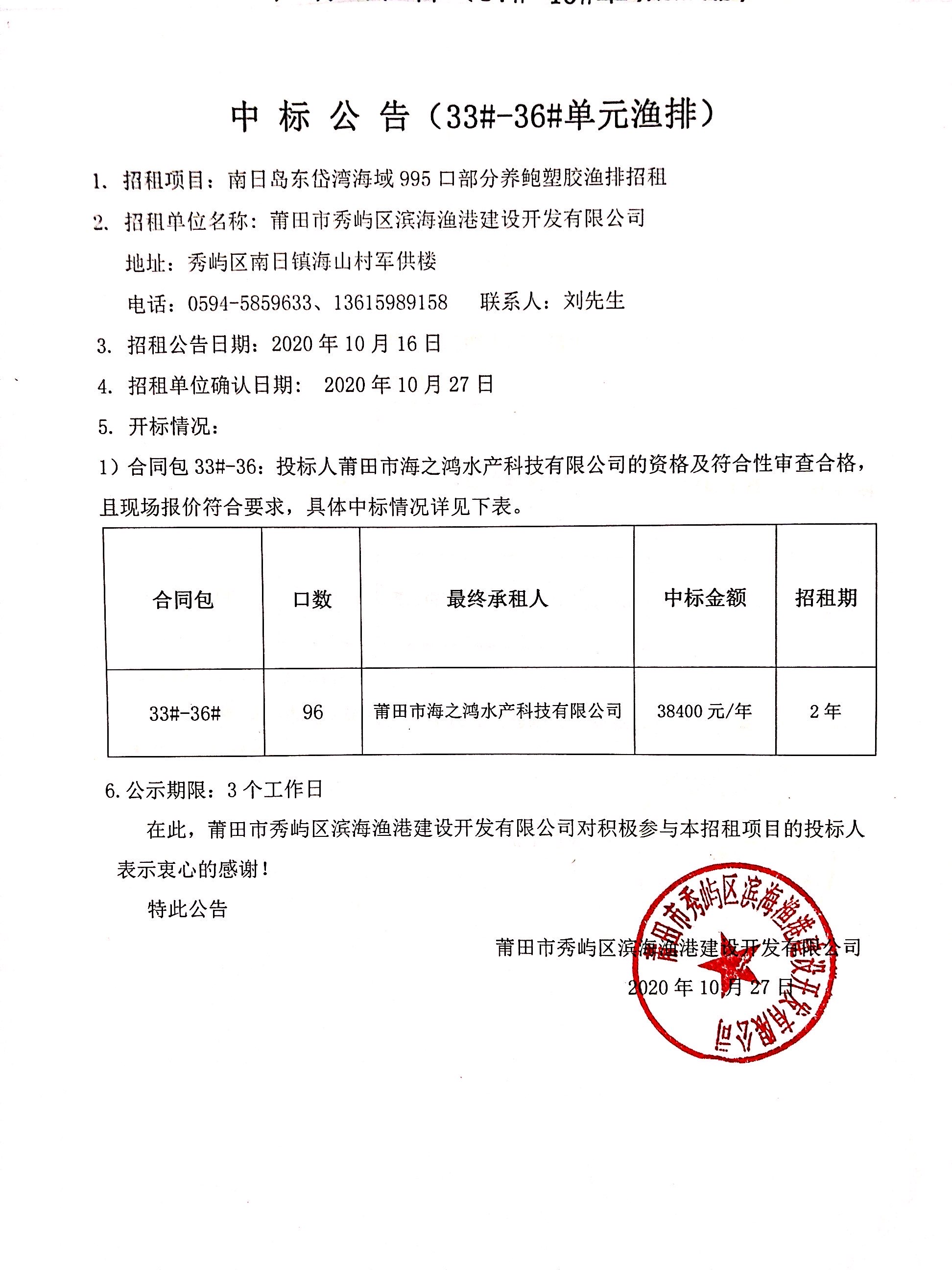 南日岛东岱湾海域995口部分养鲍塑胶渔排招租情况公告(五)(33#-36#单元渔排中标公告)
