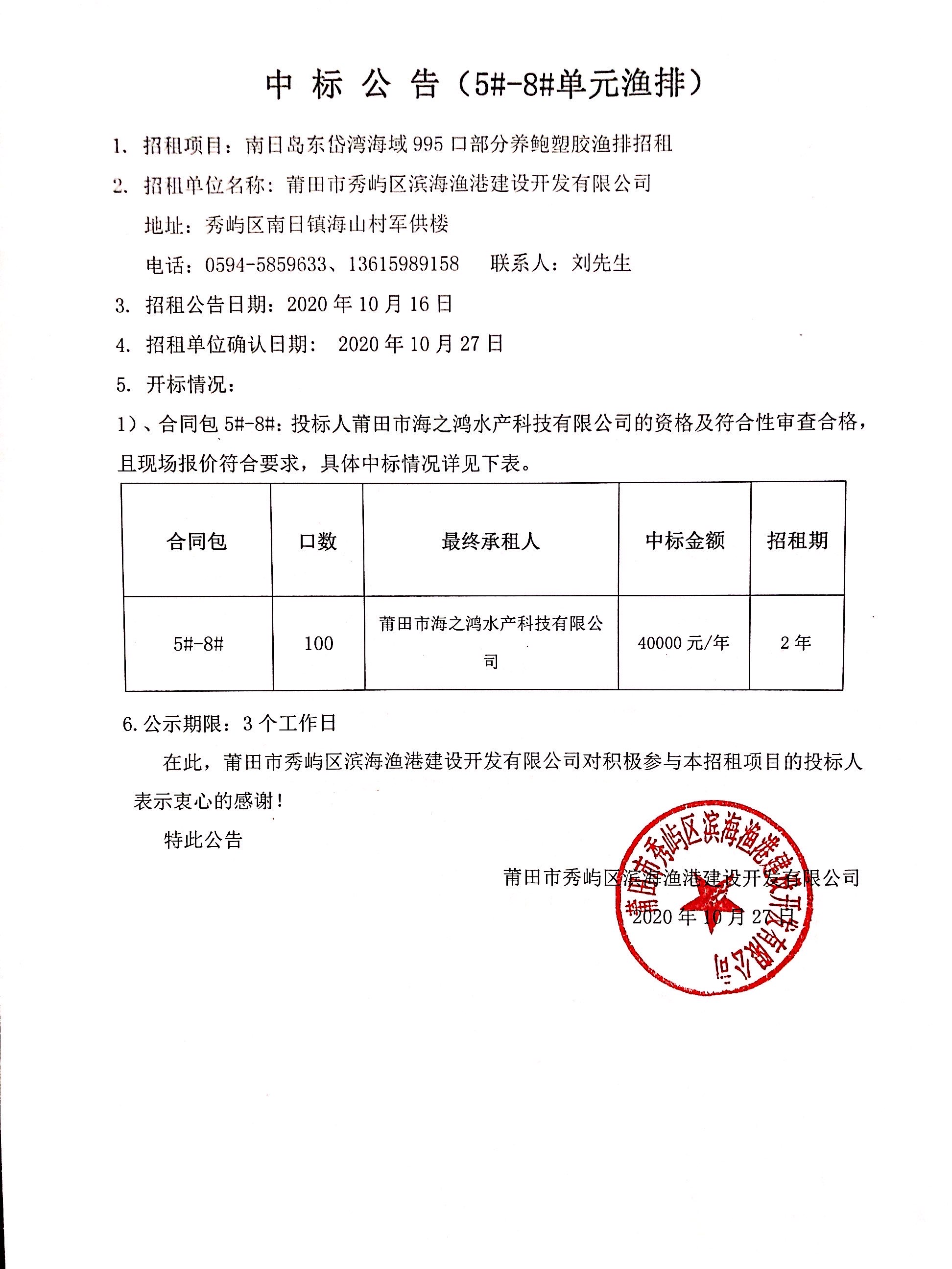 南日岛东岱湾海域995口部分养鲍塑胶渔排招租情况公告(一)(5#-8#单元渔排中标公告)