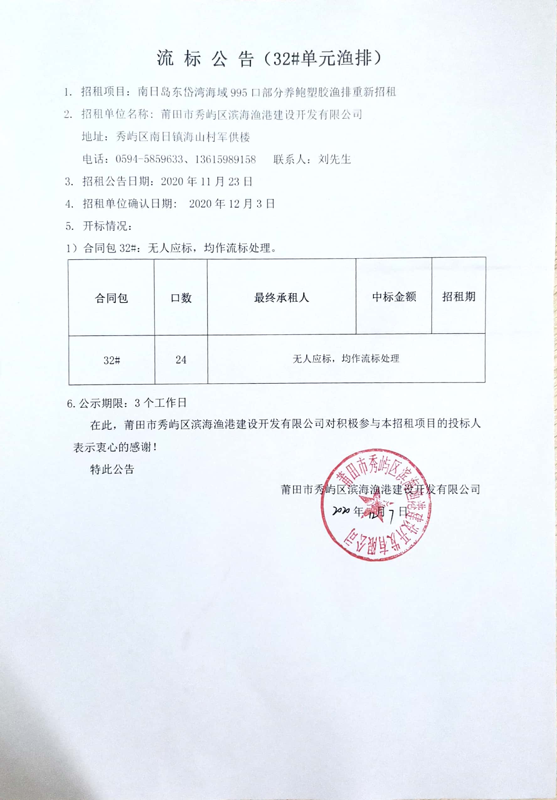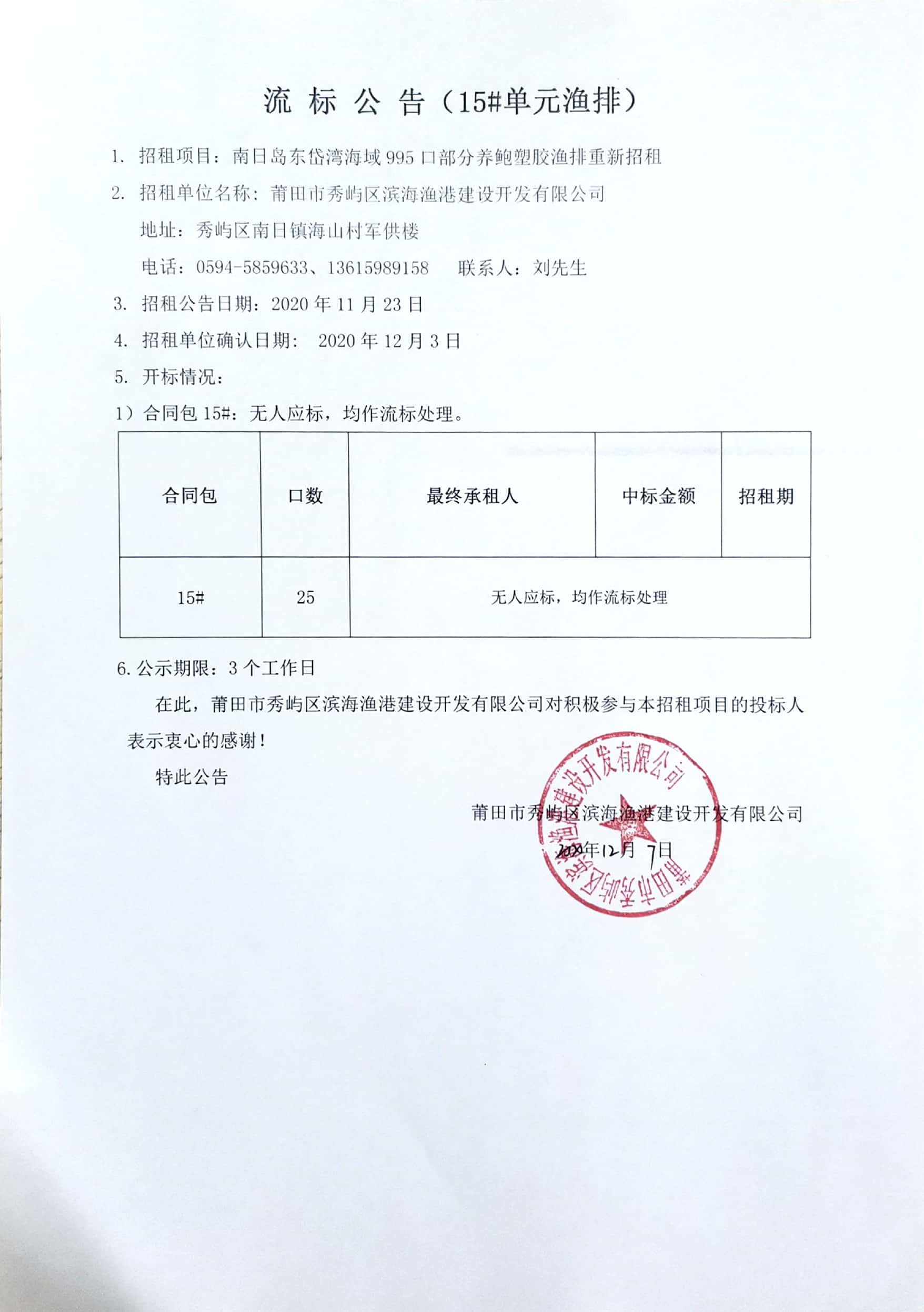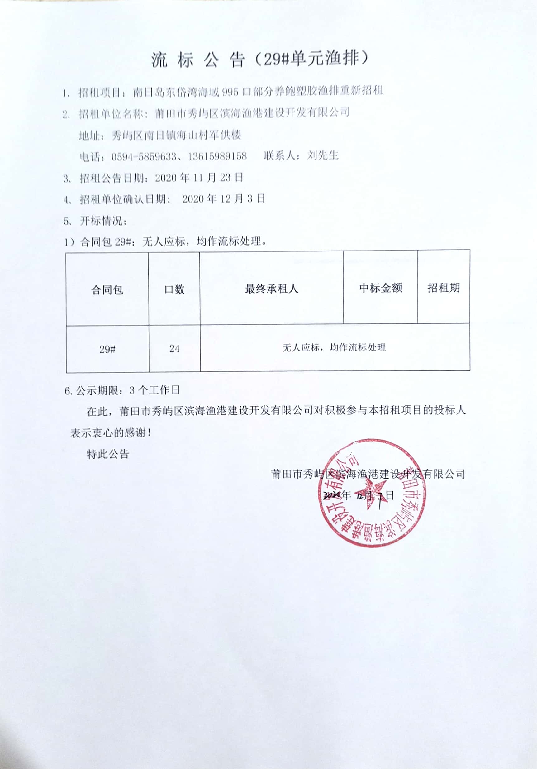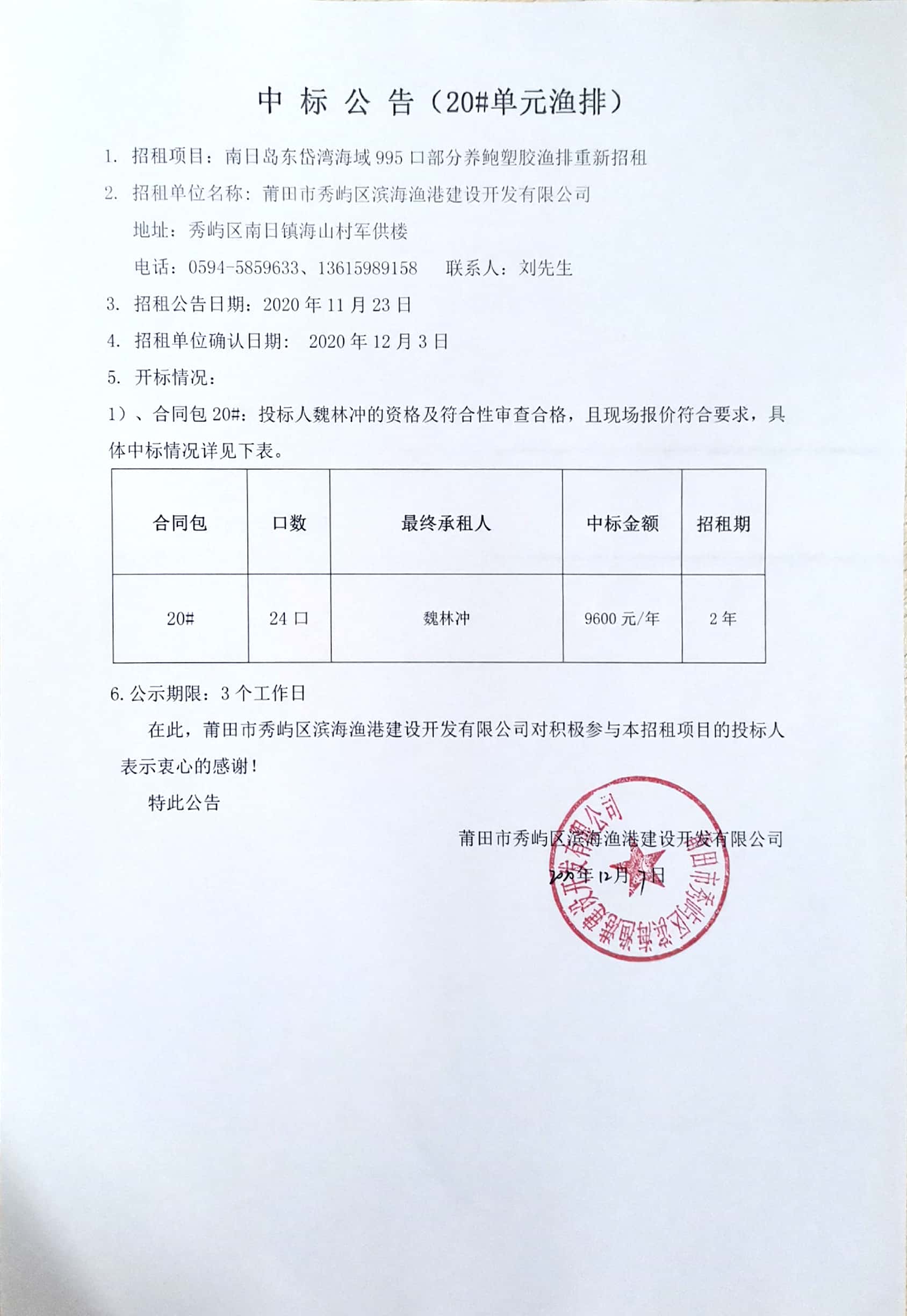 南日岛东岱湾海域995口部分养鲍塑胶渔排重新招租情况公告