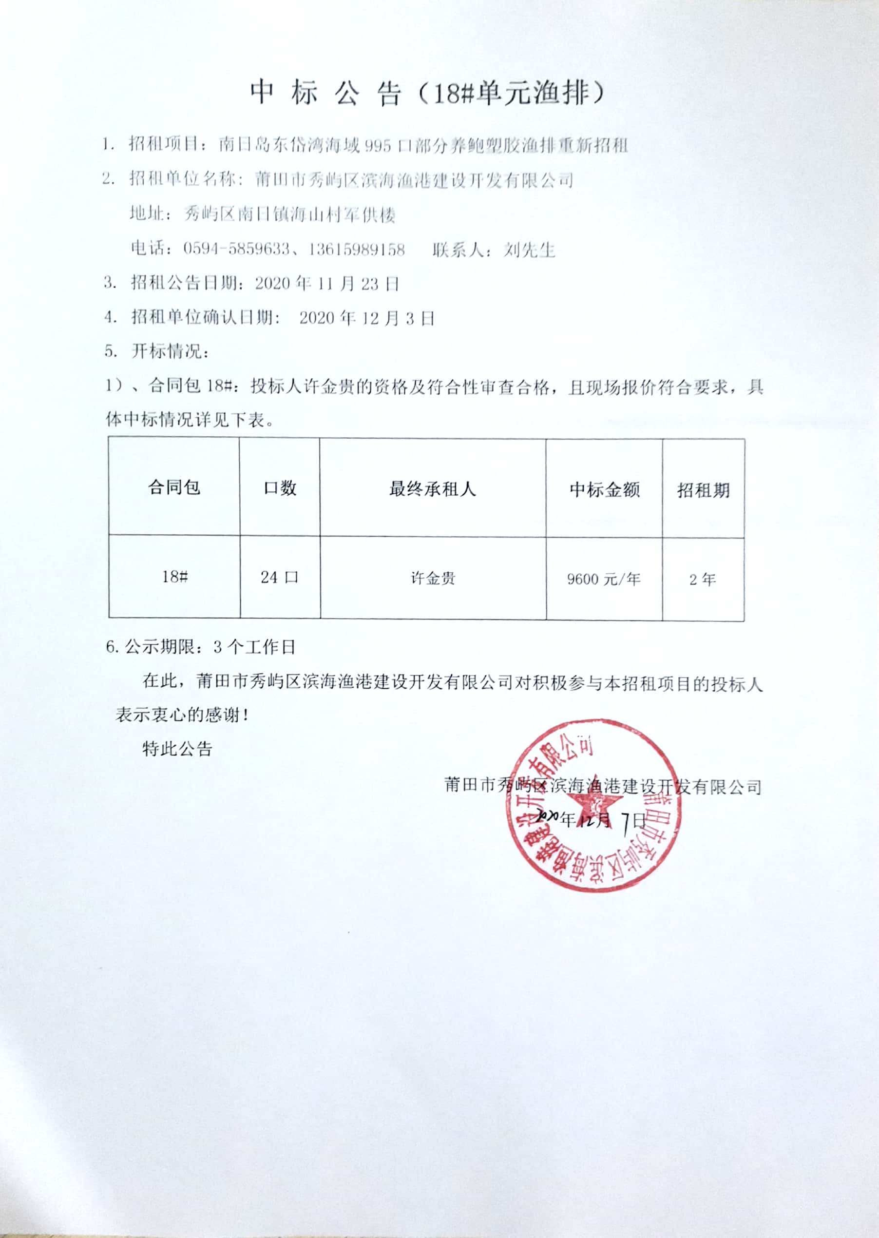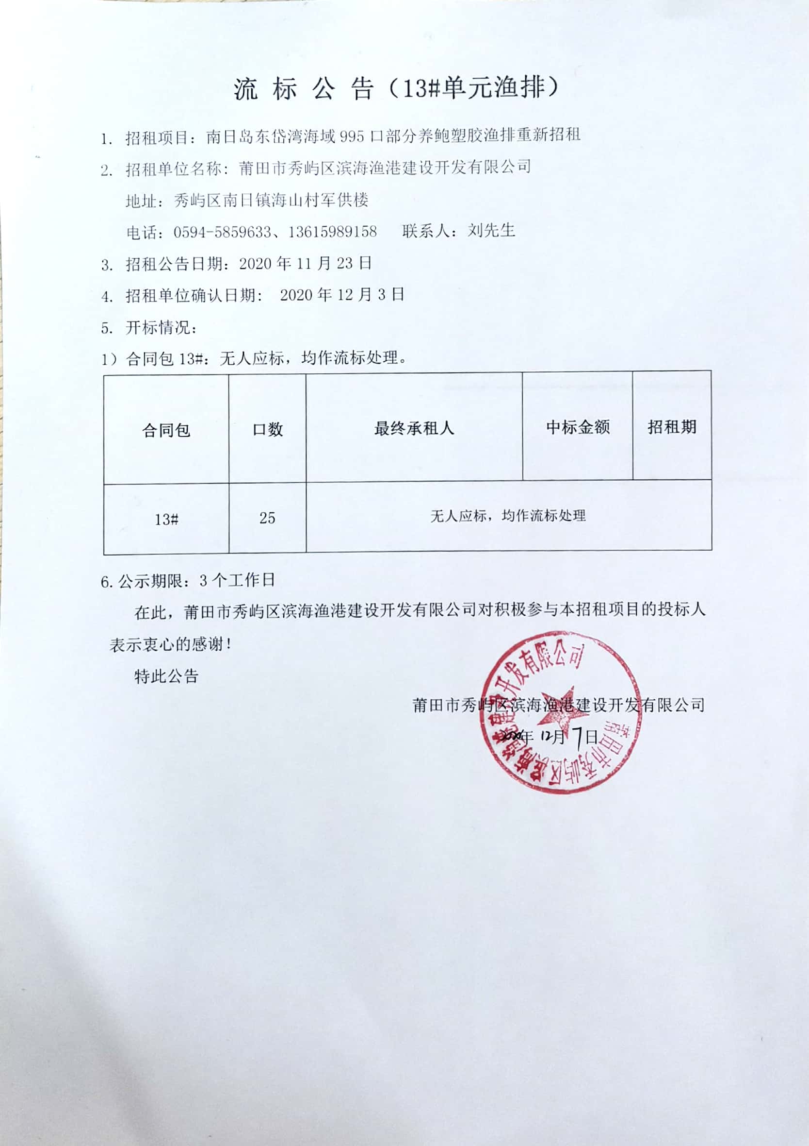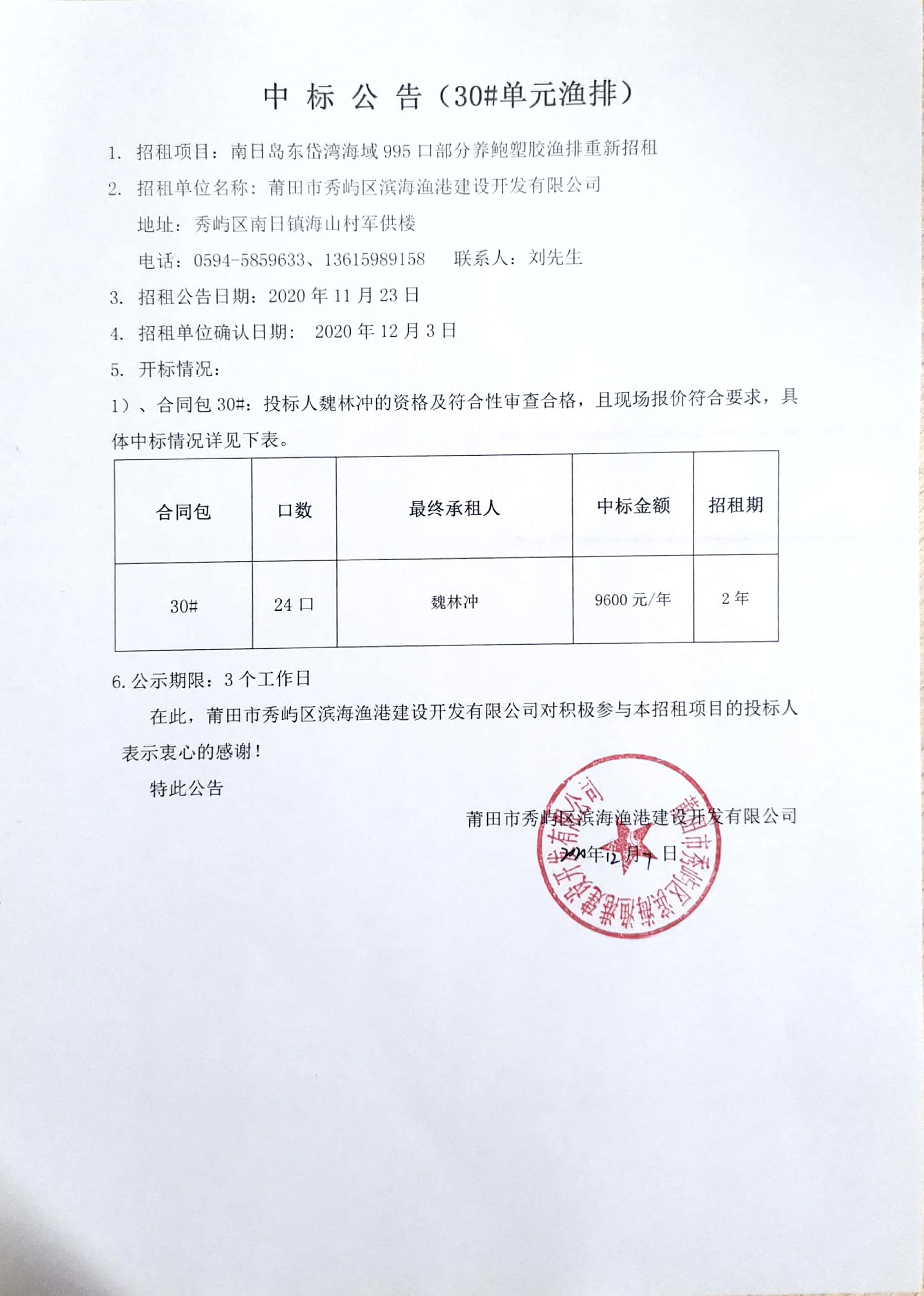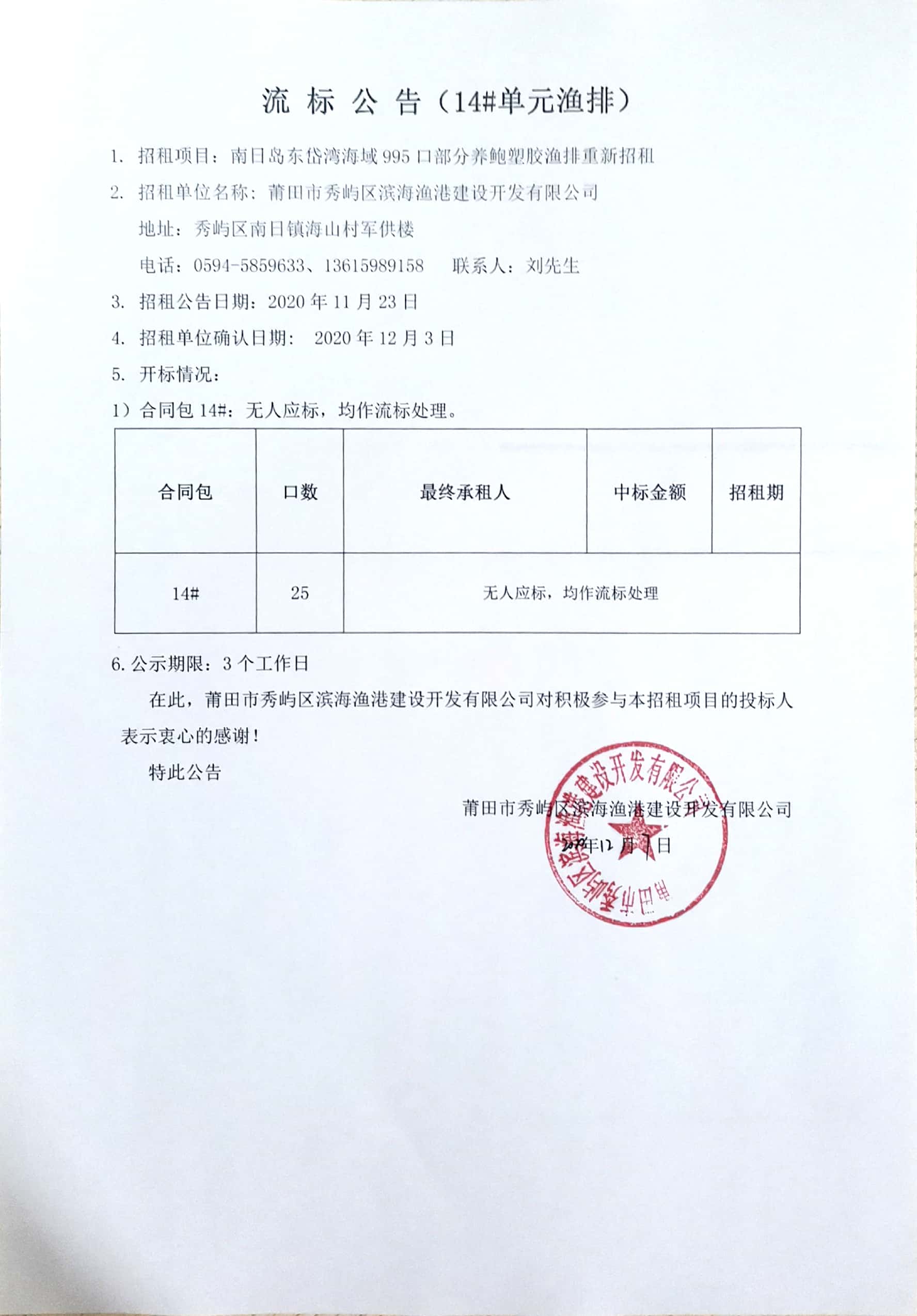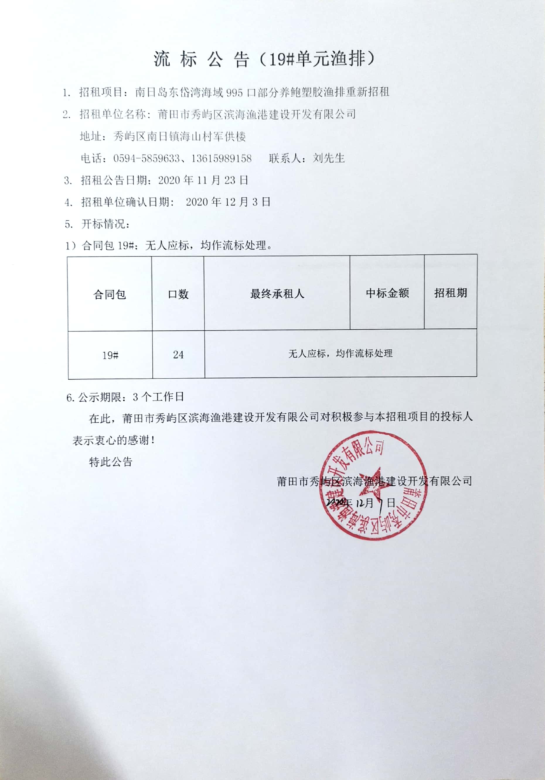 南日岛东岱湾海域995口部分养鲍塑胶渔排重新招租情况公告