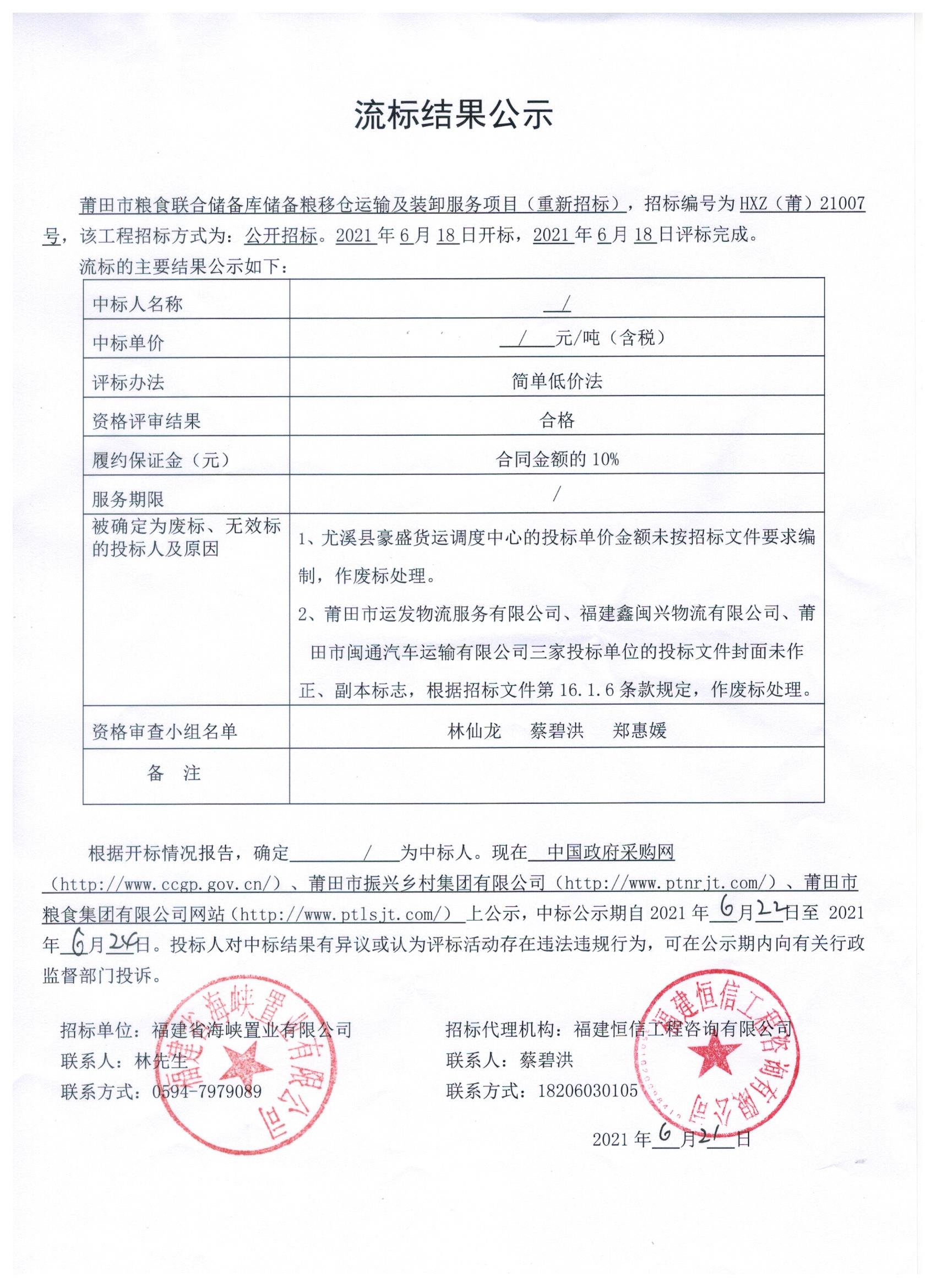 莆田市粮食联合储备库储备粮移仓运输及装卸服务项目(重新招标)流标结果公示