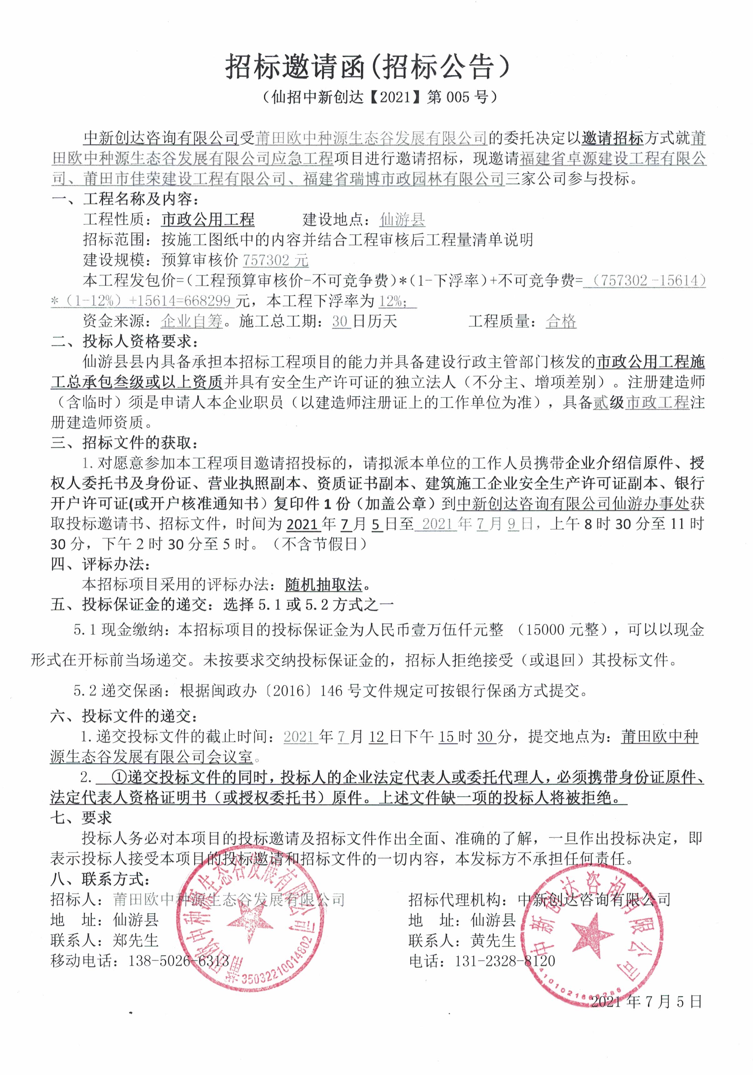 莆田市欧中种源生态谷发展有限公司应急工程项目招标邀请函(招标公告)