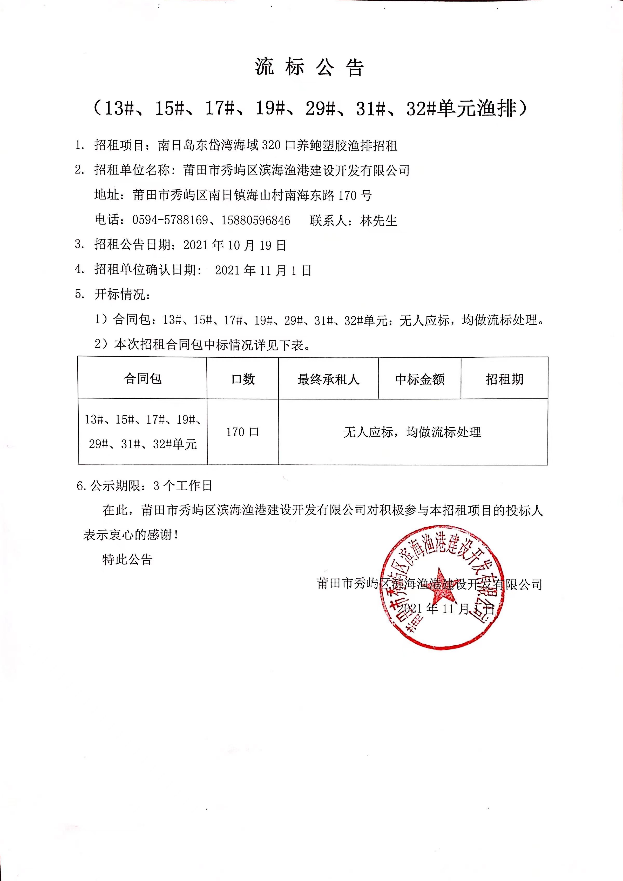 南日岛东岱湾海域320口养鲍塑胶渔排流标公告(13#、15#、17#、19#、29#、31#、32#单元渔排)