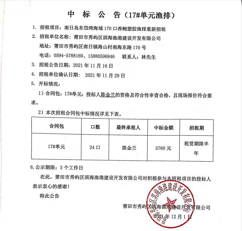 南日岛东岱湾海域170口养鲍塑胶渔排重新招租中标公告(17#单元渔排)