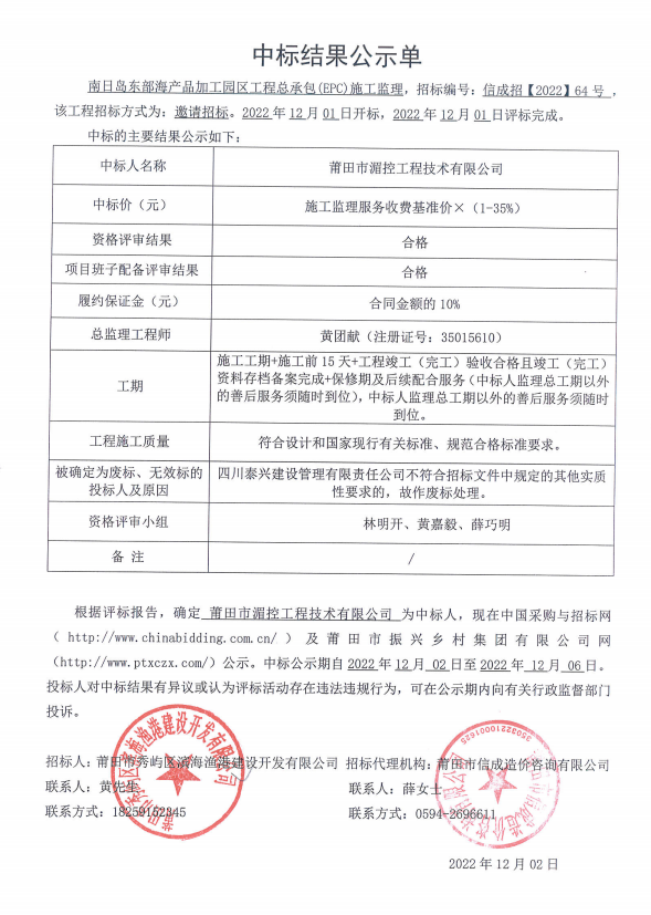 南日岛东部海产品加工园区工程总承包(EPC)施工监理中标结果公示单