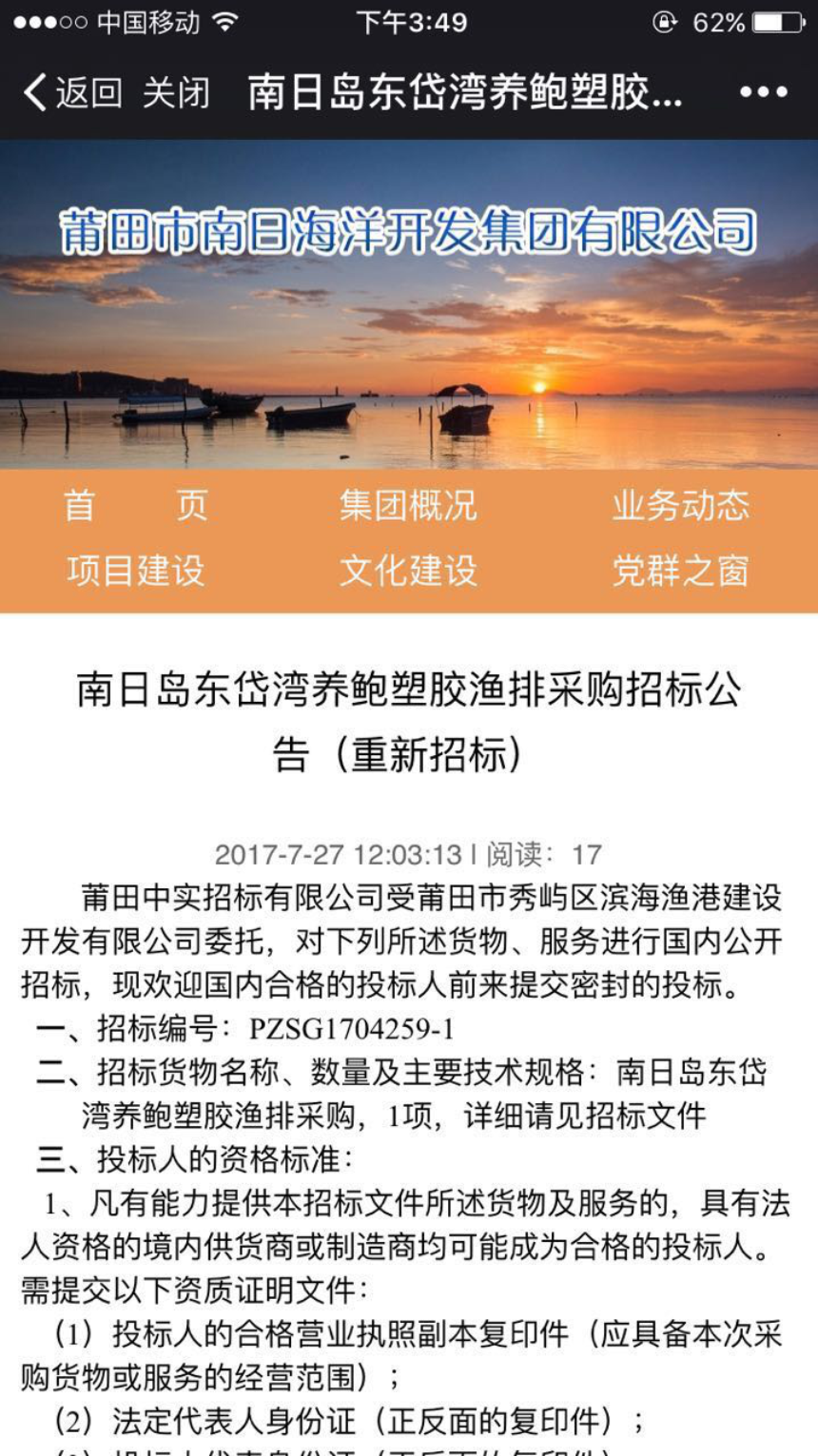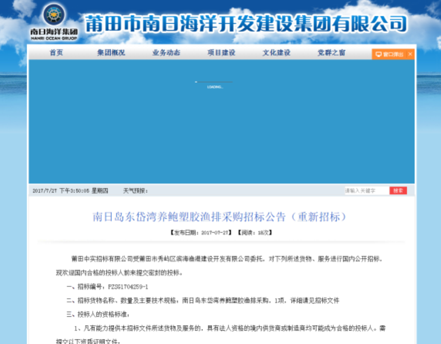 7月27日,南日岛东岱湾养鲍塑胶渔排采购重新招标公告在莆田市行政服务中心、集团网站和集团微信公众号上发布。