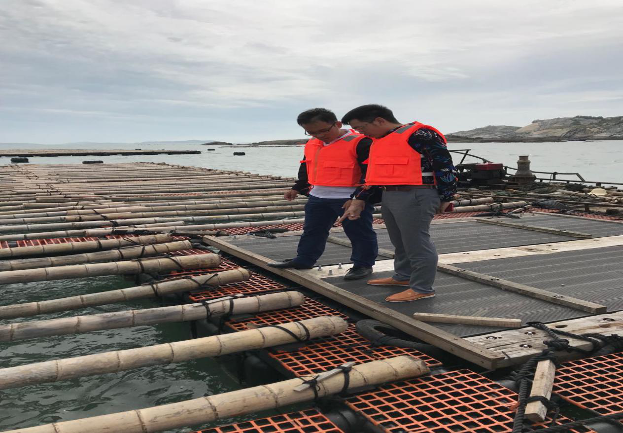 驻南日岛公司新引进的980口养鲍塑胶渔排及海马齿养殖设施,了解现有的渔排养殖设施需求及东岱湾水文环境情况,并向驻南日岛公司的技术人员讲解了以成套橡塑装备技术作为浮力系统的新型海洋工程装备,可用于海上浮动平台及防波堤等海洋工程设施。