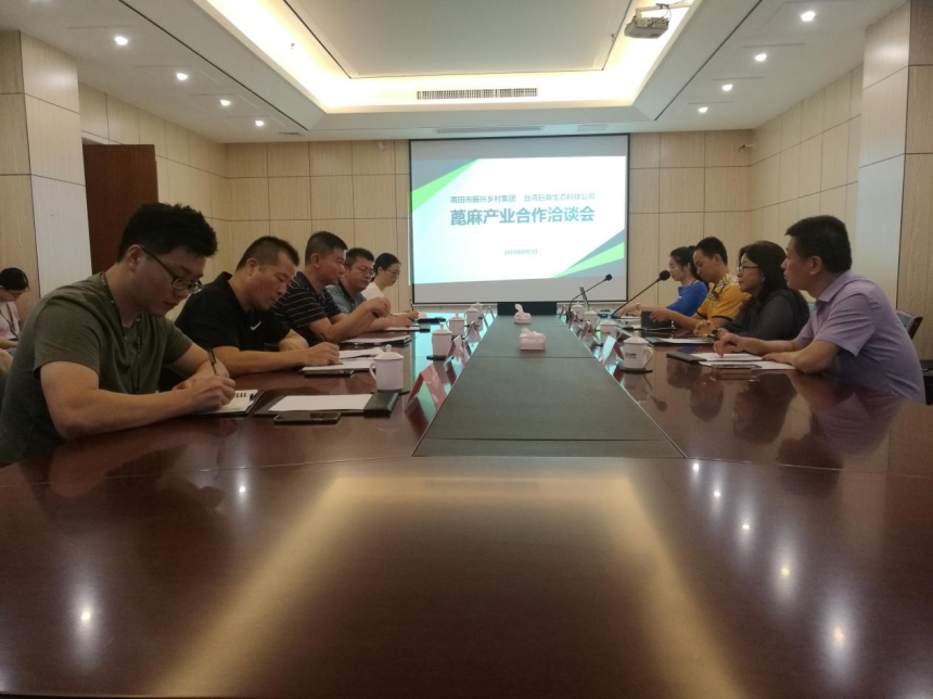 与巨鼎绿能公司就对项目合作模式进行深入探讨。 会上,李新洪总经理说,对台商而言,福建是离得最近、市场规模最大、环境最为友好、最有发展潜力的大市场。两岸一家亲,非常欢迎巨鼎绿能公司台资企业与集团合作,深度挖掘市场潜力,共谋发展。市振兴集团作为实施莆田市乡村振兴战略的主要抓手,响应市委市政府的号召,突出产业兴旺,科技兴农、绿色兴农,积极推进实施莆田市乡村振兴战略的投资和运营。李新洪总经理指出,为了加快双方合作,集团与巨鼎绿能公司签订战略合作框架协议,共同投资建设国内蓖麻产业项目,91网 负责提供规模土地,作为项目发展的储备用地,由巨鼎绿能公司提供高产蓖麻种苗、技术咨询、蓖麻种植与蓖麻蚕养殖技术合作等高技术支持与保障。在此基础上,双方可根据实际情况,进一步拓展合作,共同投资建设蓖麻精深加工厂及延伸产业链,进行深度合作。