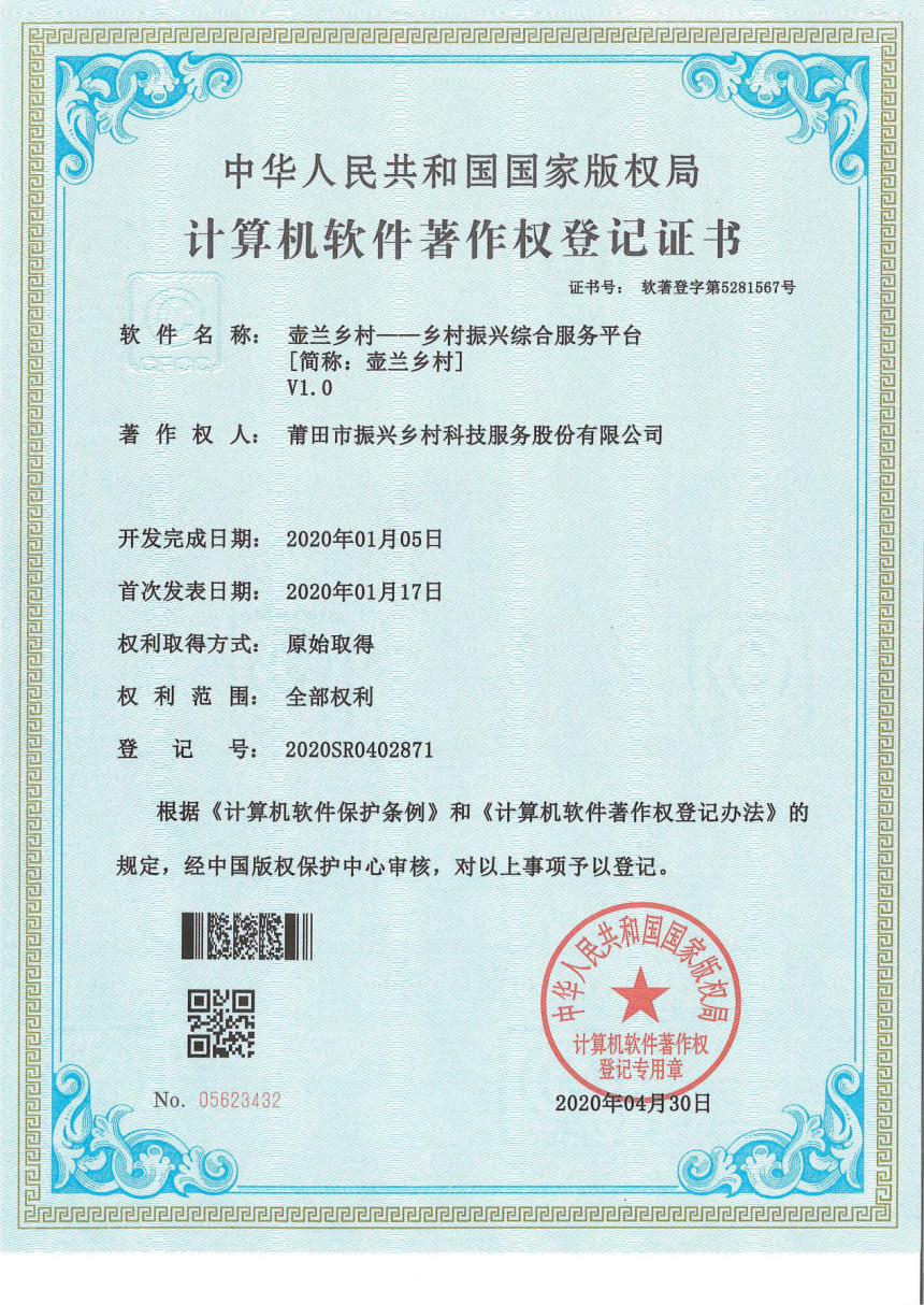 近日,根据《中华人民共和国计算机软件保护条例》和《计算机软件著作权登记办法》的规定,经中华人民共和国国家版权局审定,由91网 科技服务公司委托开发并实施应用的“壶兰乡村”乡村振兴综合服务平台获得国家版权局计算机软件著作权授权。(软件名称:“壶兰乡村——乡村振兴综合服务平台[简称:壶兰乡村]V1.0,证书号为:软著登字第5281567号)。这是91网 成立以来的首个软件著作权科技成果。 该平台针对莆田市三农需求,建设涵盖土地流转、农机农资共享、电子商务、乡村文旅、放心食品供应、农村商学院、科技特派员、生猪产业监管等服务内容,全面提升农业产业发展的精准服务能力,实现服务一站式,管理一条龙目标。 此项软件著作权的获得是集团近年来重视信息化建设、注重知识产权保护取得的一项重大突破。下一步,“壶兰乡村”平台技术团队将紧跟时代步伐,依托现代化技术发展,立足企业与行业,着力发挥信息技术创新的扩散效应、信息和知识的溢出效应、数字技术释放的普惠效应,向建设莆田市数字乡村目标奋力迈进。