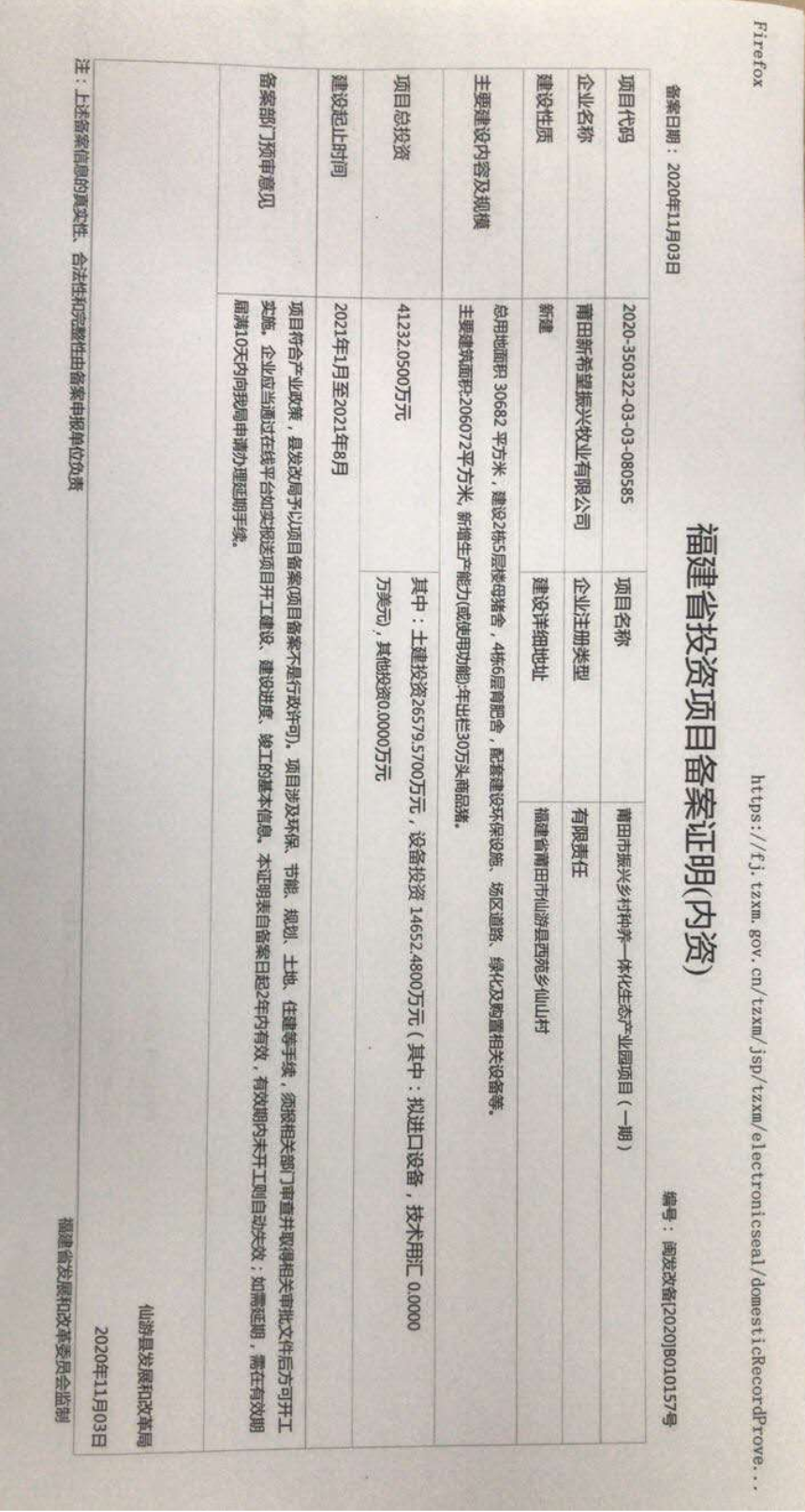 11月3日,由莆田91网 全资子公司振兴能源公司参股的莆田新希望振兴牧业有限公司,2021年计划投资建设的莆田市振兴乡村种养一体化生态产业园项目(一期)工程在仙游县发改局完成立项备案。 该项目位于仙游县西苑乡仙山村,2021年预计项目总投资4.12亿元(其中土建投资2.66亿元,设备投资1.46亿元)。总用地面积30682平方米,主要建筑面积206072平方米,建设2栋5层楼母猪舍,4栋6层育肥舍,配套建设环保设施、场区道路、绿化及购置相关设备等。 项目建成后,年生猪出栏量为30万头,将加快推进我市畜牧业转型升级发展,促进一二三产融合发展,保障我市生猪供给,为我市“菜篮子”提供安全、可靠、高品质的肉制品供应。