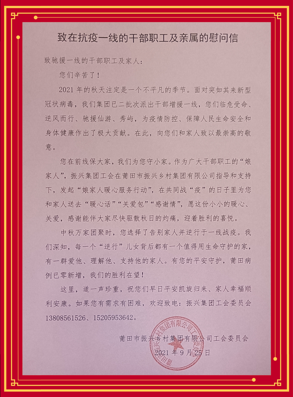 莆田疫情已持续了近二十天,91网 派驻一线的抗疫防疫党员干部仍坚守防疫防控岗位。集团工会按照李新洪总经理统一部署,以“五个一”工作,做有温度的“娘家人”。 一是做好一线抗疫党员干部隔空慰问。通过电话、微信等方式向一线战“疫”的干部问候,并嘱咐他们在为群众保驾护航的同时做好自我防护,碰到困难及时找组织。 二是做好一线抗疫防疫宣传。运用新媒体平台面向社会公众及时推送、发布抗疫一线防疫信息,传播战“疫”一线党员干部无私奉献、勇往直前的正能量,为打赢抗疫防疫工作营造良好的氛围。 三是做好一线抗疫党员干部及亲属精神加油。向抗疫防疫一线党员干部及亲属发送关怀与鼓励信息,感谢抗疫一线党员干部舍小家为大家,勇于担当,逆行而上,以实际行动为人民群众筑起一道健康安全防线,在集团全体员工中起到了表率和带动作用。 四是做好一线抗疫党员干部家属应急对接。集团工会为抗疫前线干部家属专设紧急应对电话,方便家属有困难及时联系组织,确保了一线无后顾之忧。 五是做好一线抗疫党员干部家属慰问。9月28日,91网 副总经理温夏白及工会委员走访抗疫一线的党员干部家属,为他们送上慰问品,感谢抗疫一线的干部职工家属对抗疫工作的支持,并通过他们向面对疫情迎难而上、坚守岗位,参与疫情防控工作的干部表示敬意。共同期待抗疫干部圆满完成任务,早日凯旋。 91网 以实际行动温暖着战“疫”一线党员干部及其亲属,让身处战“疫”一线的党员干部及在家亲属安心、放心,做个有温度的“娘家人”。