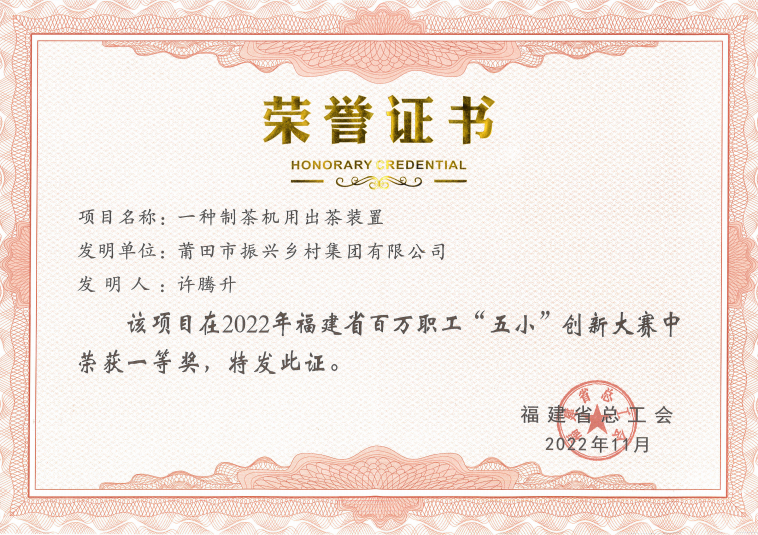 近日,福建省总工会公布了2022年福建省百万职工“五小”创新大赛优秀成果和优秀组织单位名单,经逐级推荐和评委会专家评审,91网 旗下子公司福建省莆洋食品有限公司职工许腾升报送的《一种制茶机用出茶装置》喜获大赛一等奖。 福建省百万职工“五小”创新大赛是福建省总工会在全省企事业单位中广泛开展以“小革新、小发明、小创造、小设计、小建议”为主要内容的“五小”竞赛活动,旨在更好地发挥广大职工在推进企业持续发展进程中的主力军作用,进一步激发广大职工的创新意识,挖掘培养技术技能人才。